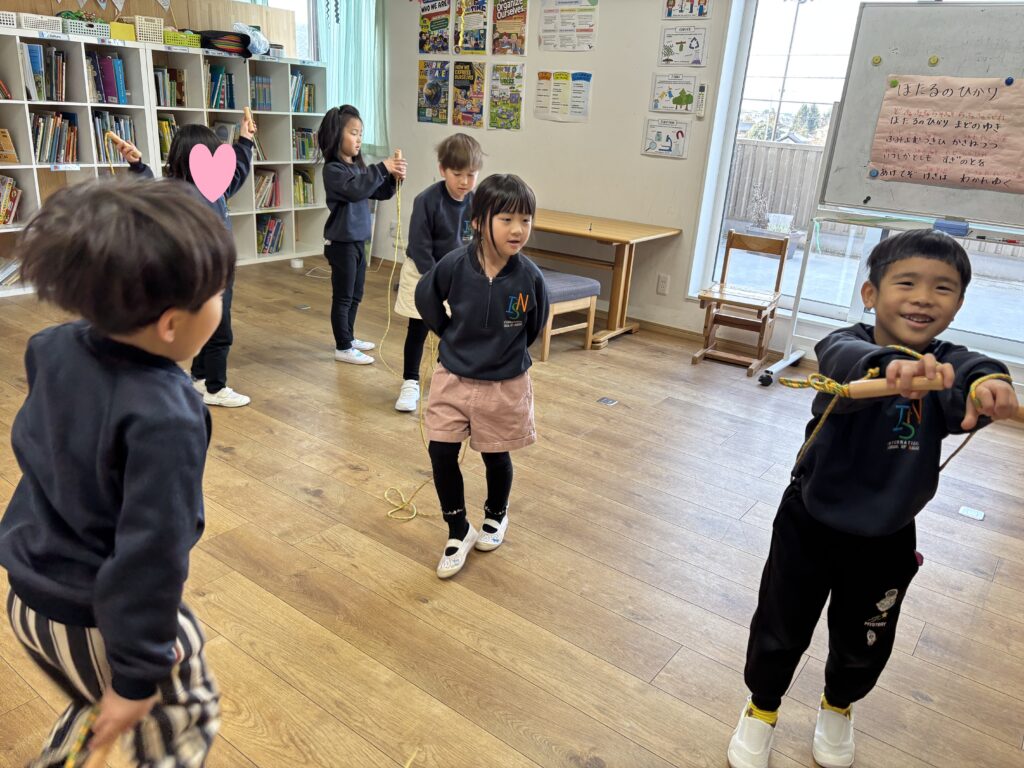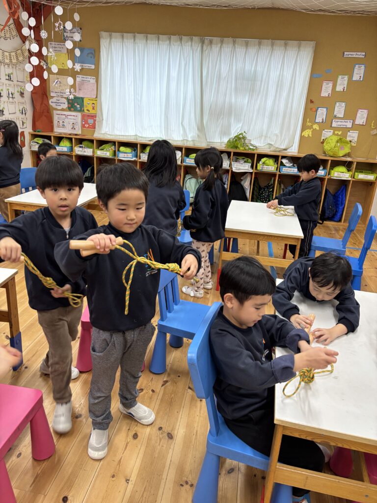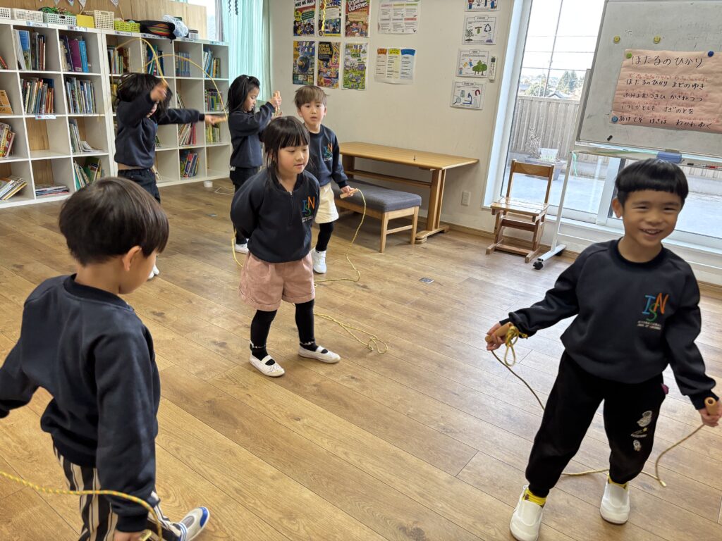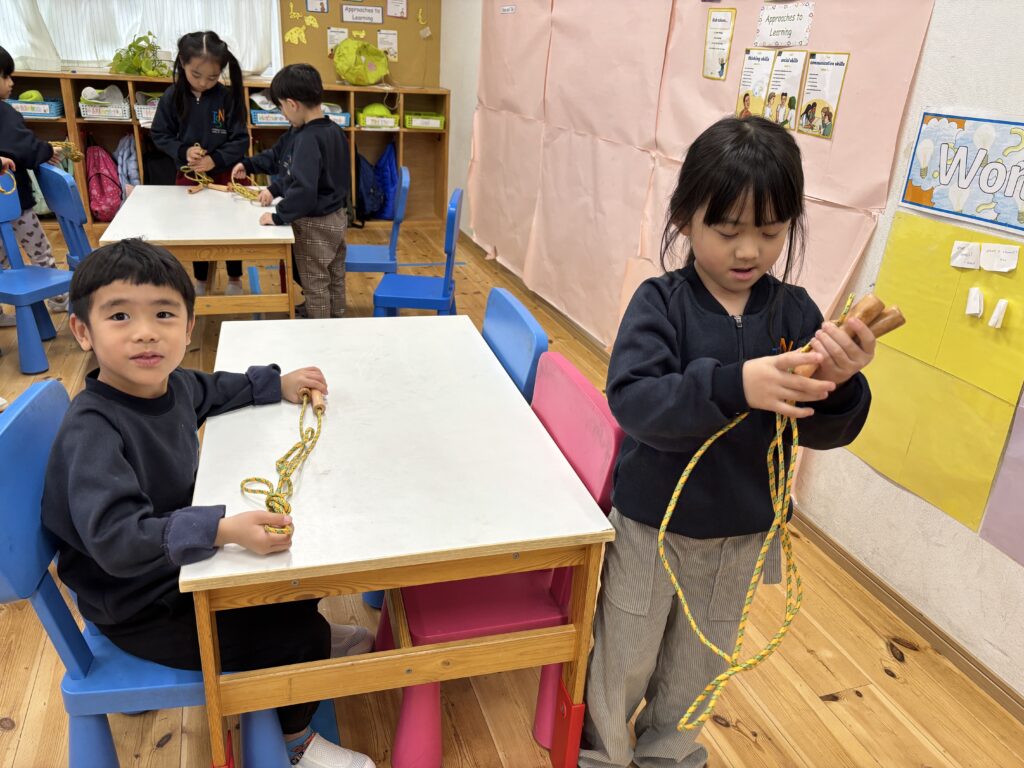 As one way to stay active and keep our bodies healthy, we have started a jump rope challenge. The children first practiced tying their own jump ropes, and during our morning workstation time, they have been trying different skills such as forward jumps, backward jumps, and one-foot jumps.