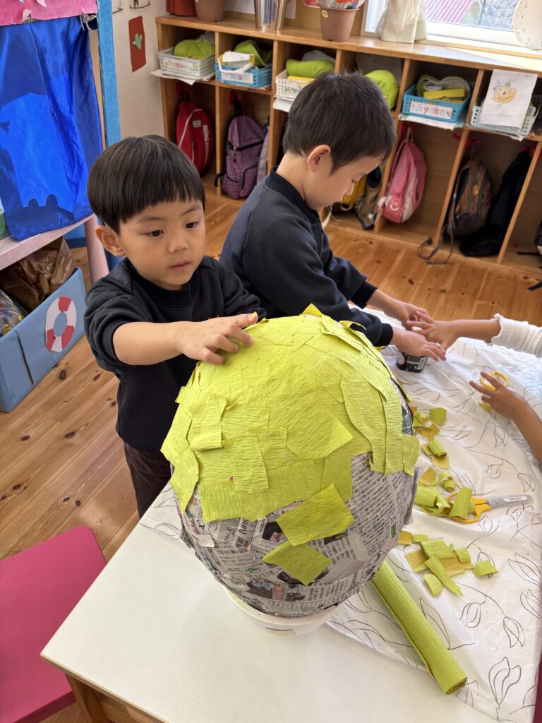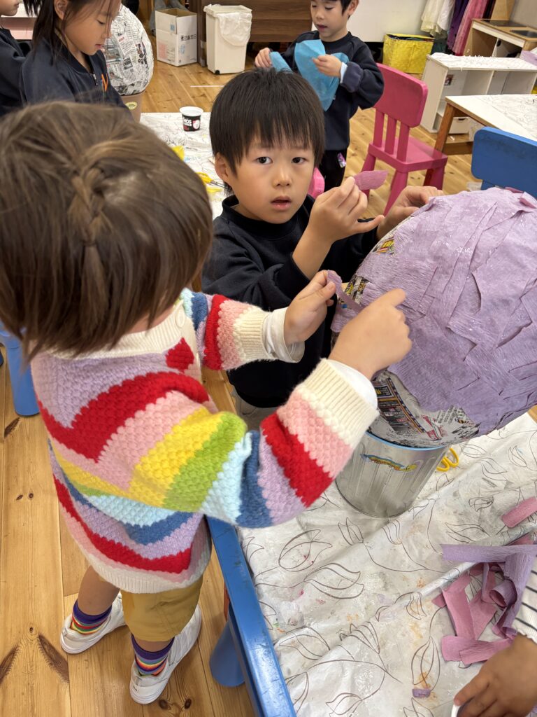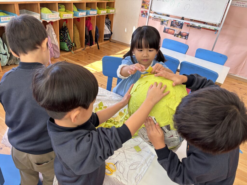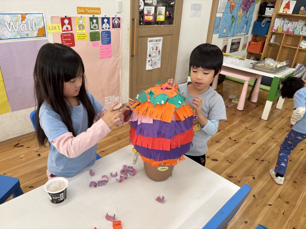 We’re enjoying crafting for our big Halloween event. In class, we made piñatas as a group activity. A piñata is a kind of decorative box originating from Spain and Latin America. Each group came up with their own design and worked together to cover balloons with newspaper and colored paper. Even with glue-covered hands, everyone was engrossed, exclaiming “This is fun!” as they worked, and four wonderful piñatas were completed!