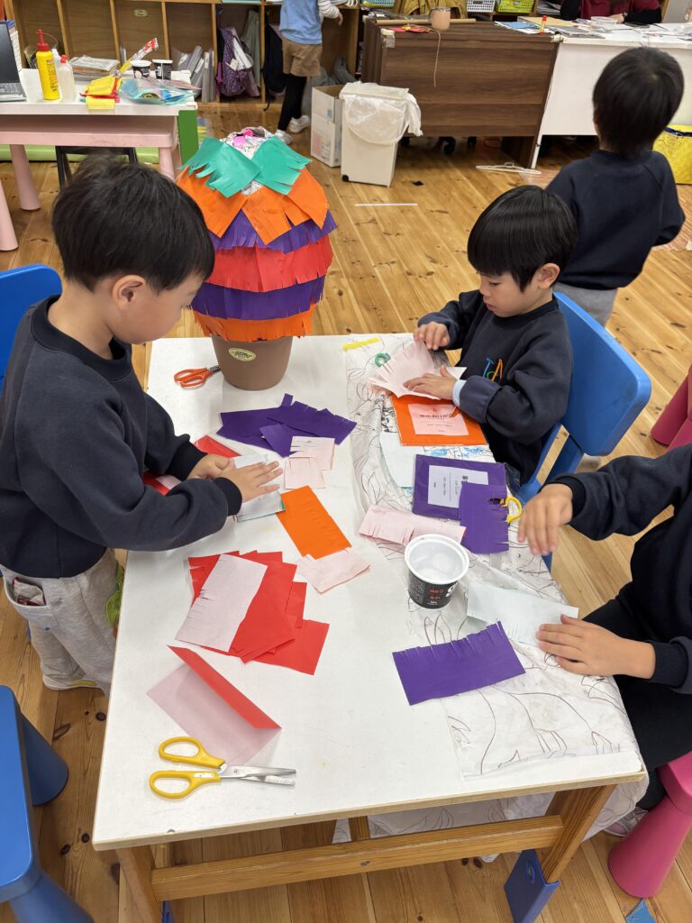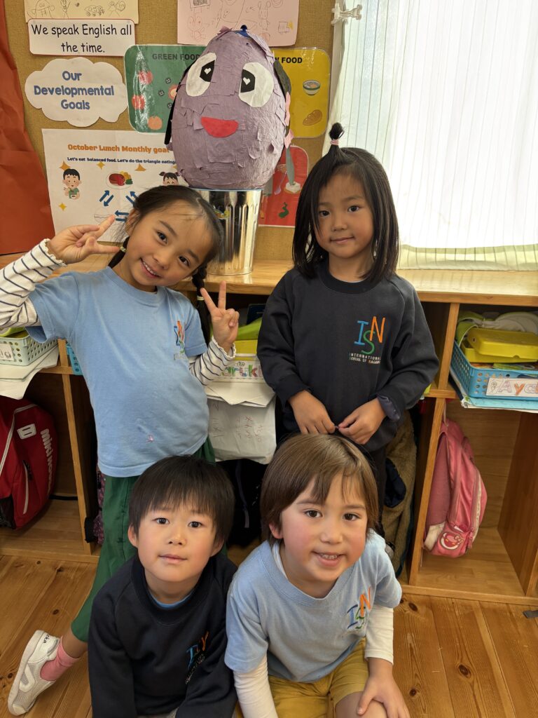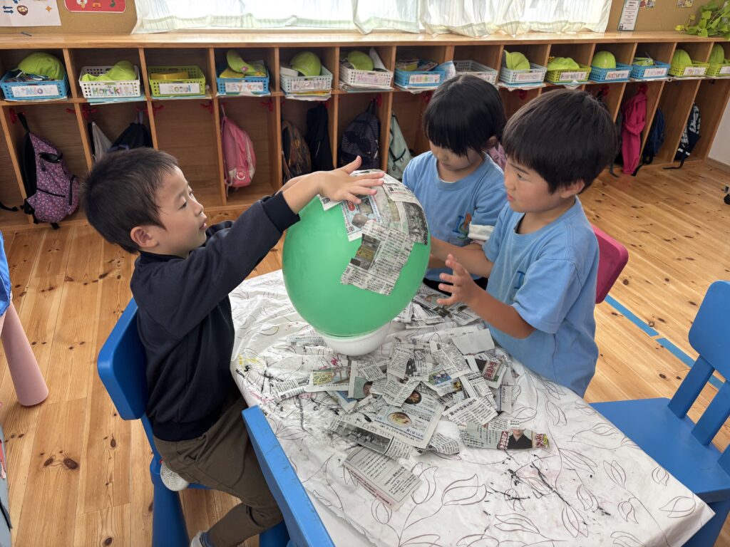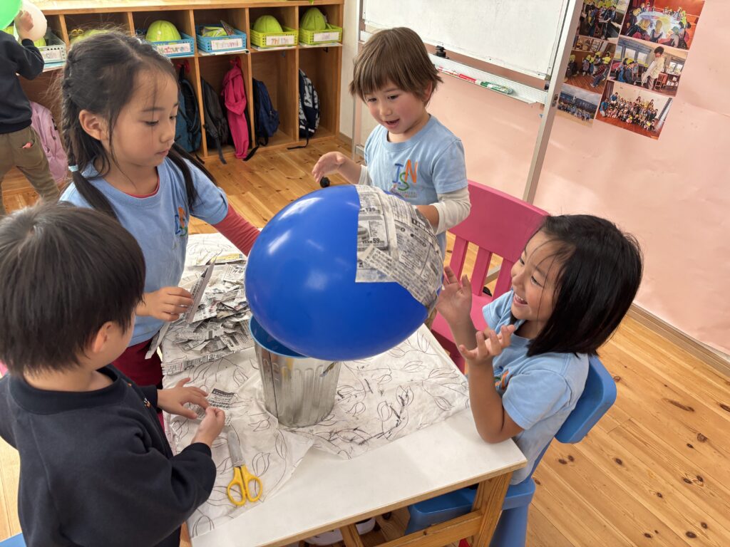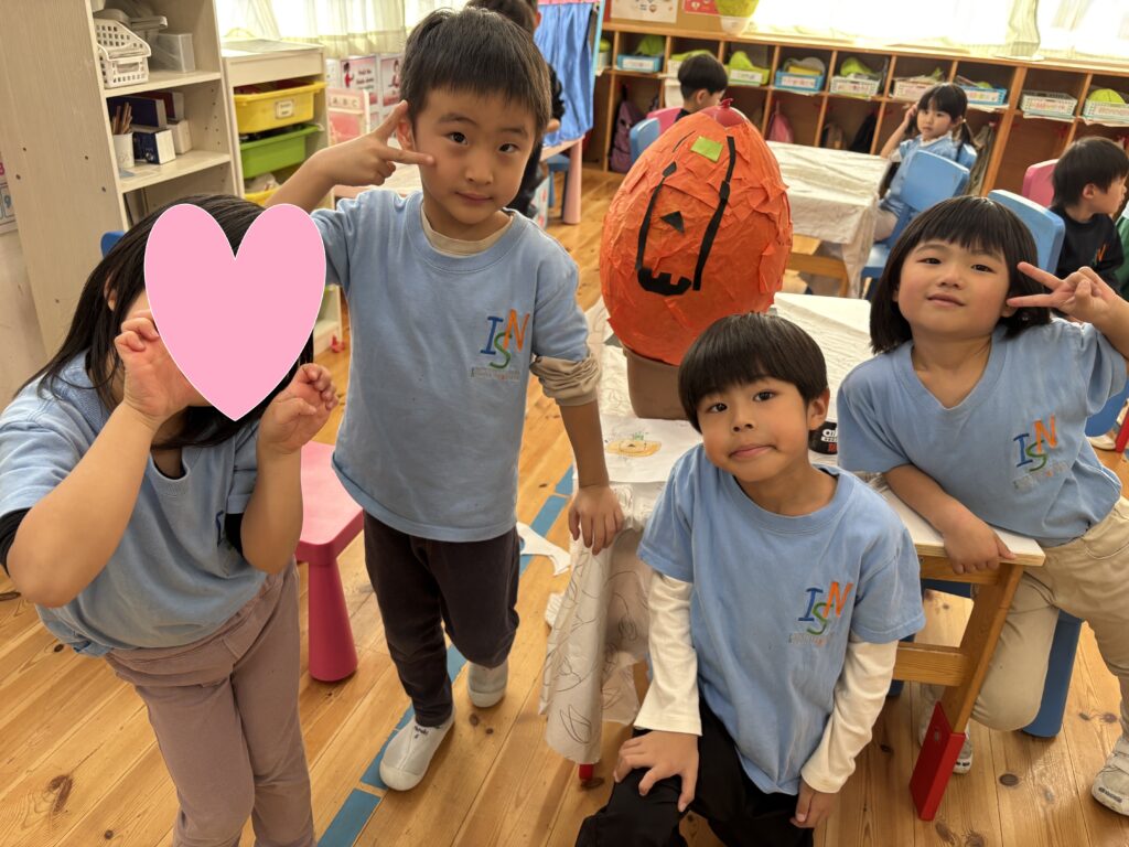 We’re enjoying crafting for our big Halloween event. In class, we made piñatas as a group activity. A piñata is a kind of decorative box originating from Spain and Latin America. Each group came up with their own design and worked together to cover balloons with newspaper and colored paper. Even with glue-covered hands, everyone was engrossed, exclaiming “This is fun!” as they worked, and four wonderful piñatas were completed!