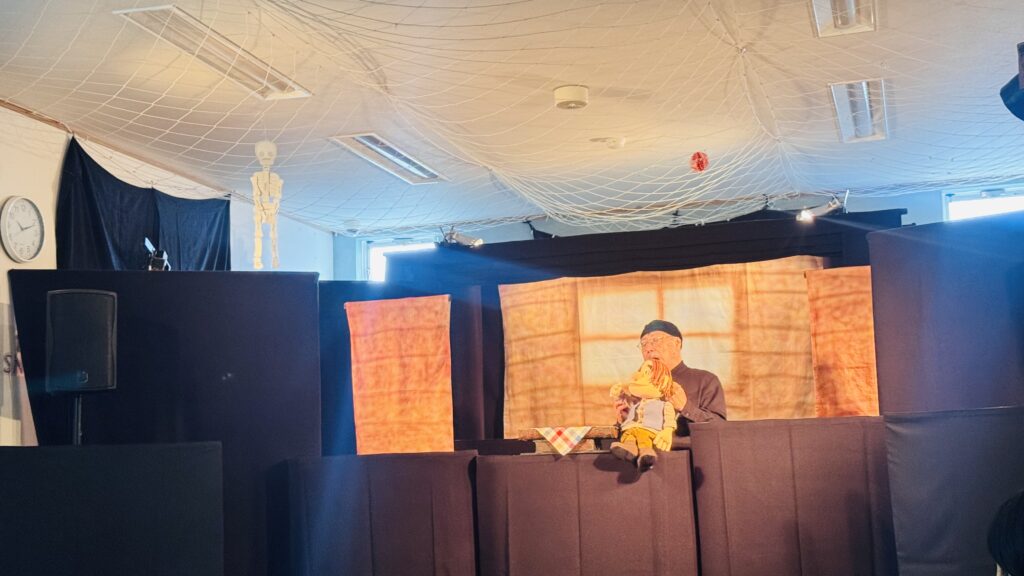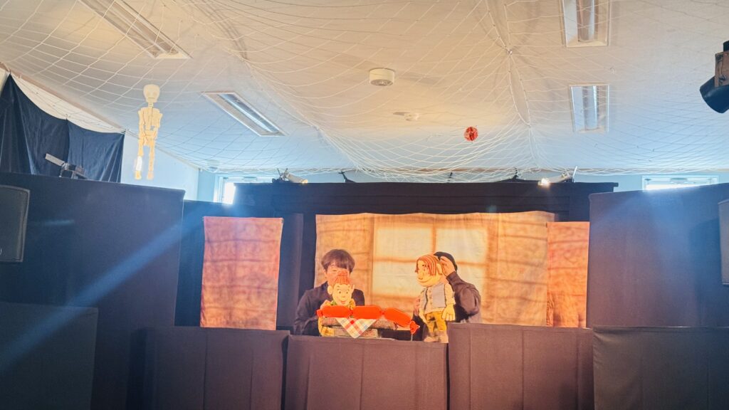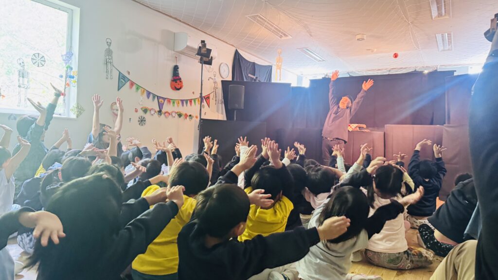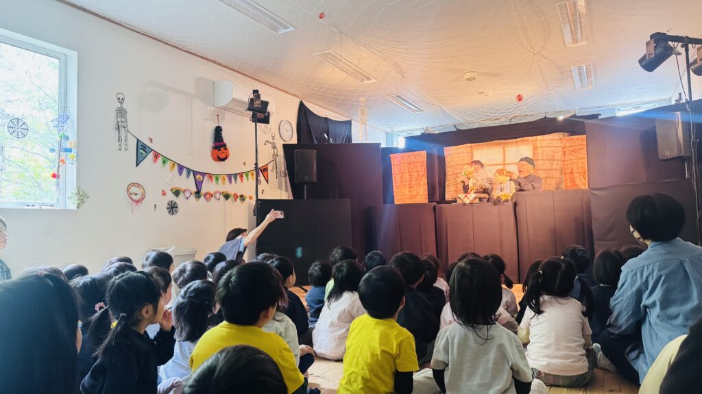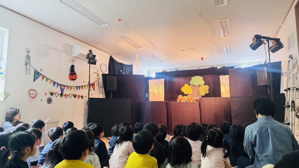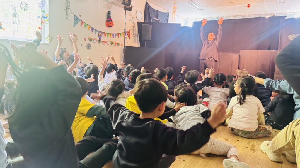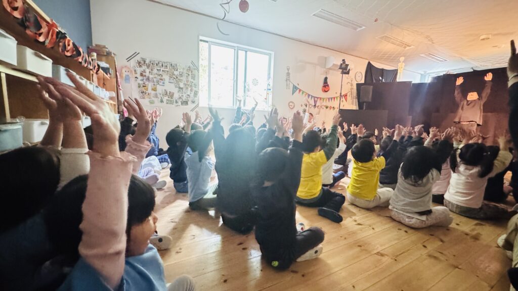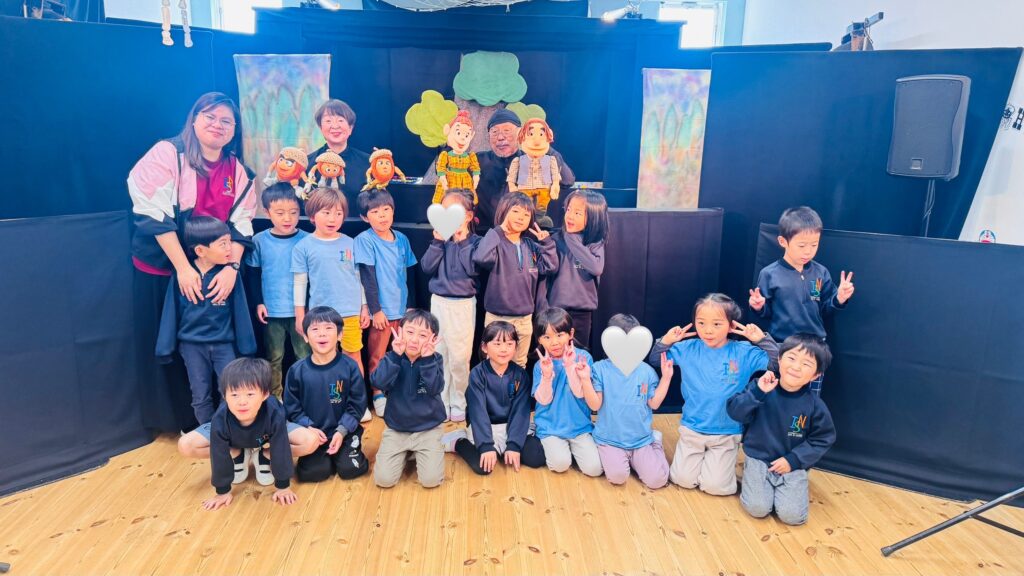 Rainforestさん達は、人形劇「三つの願い」を見てとても楽しい時間を過ごしました!お話は、ある男の人と優しいおばあさんのお話でした。男の人は食べ物を作るために木を切り倒すように頼まれましたが、その前に三つの小さなドングリが現れ、「木を傷つけなくてもいいように、三つの願いを叶えてあげましょう」と申し出ました。子どもたちは、パペットが動いたり話したりしながら魔法のような物語を生き生きと表現する様子を、目を輝かせて笑顔で見つめていました。最後は、楽しいショーを見せてくれたホーボーズのお二人に、笑顔で拍手を送りました。