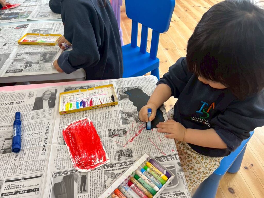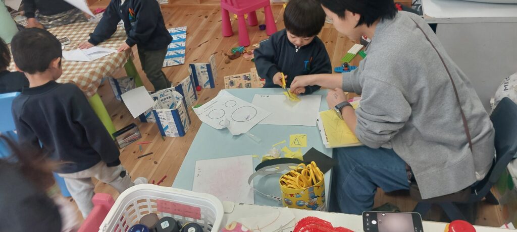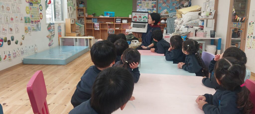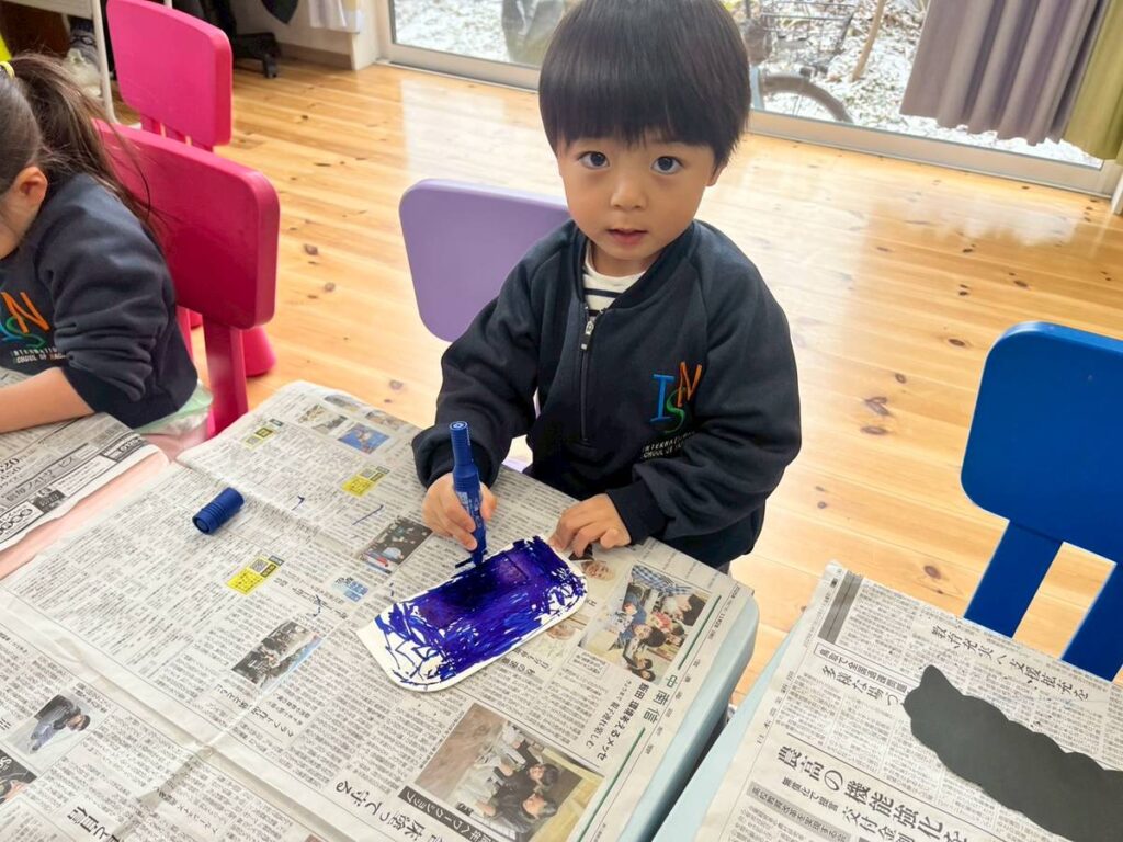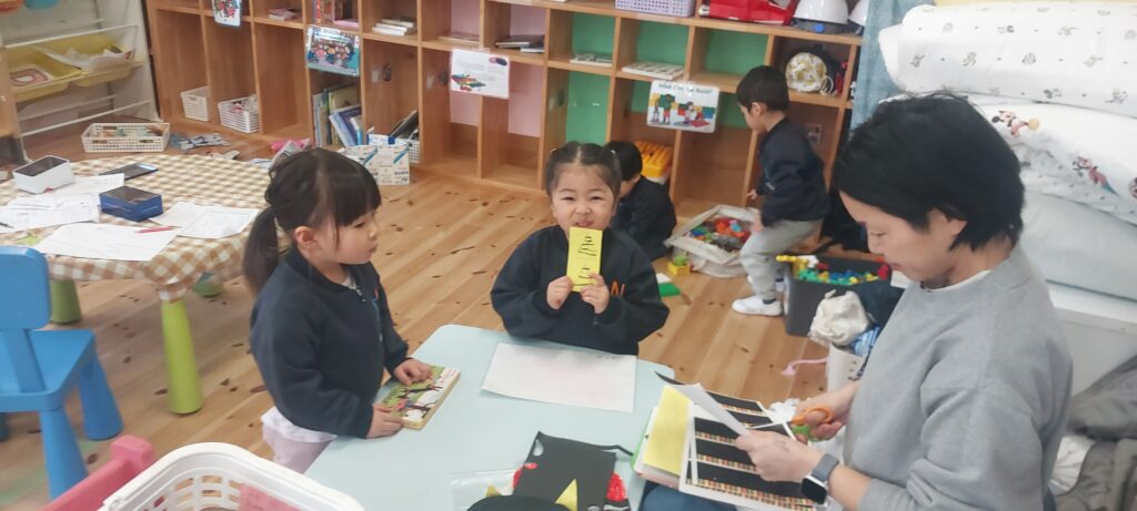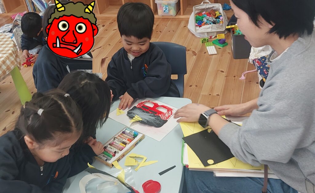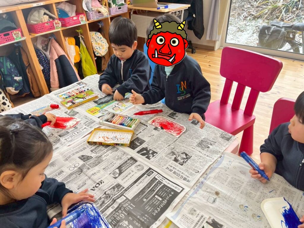 Setsubun is on its way so students colored scary demon masks for the holiday and the upcoming celebration. They practiced a little cutting, too, and made sharp horns for their masks.