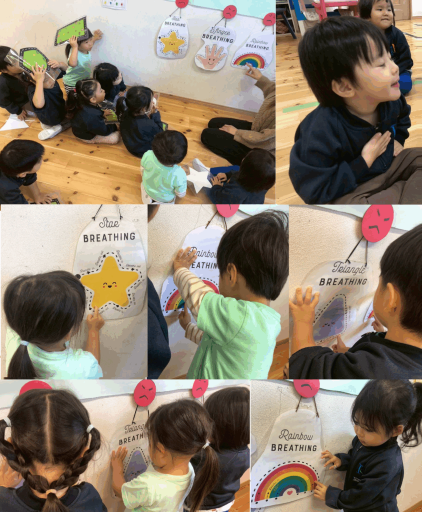 Then students showed lots of emotion and pretended to be angry, so well that their hearts beat really fast. Waterfall danced and sang, then checked their hearts again- It’s not fast, it’s slow! They breathed slowly and traced cute shapes to learn even more ways to think through difficult feelings!