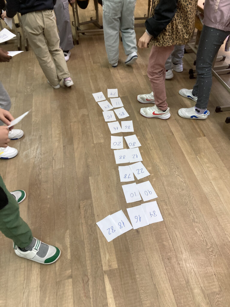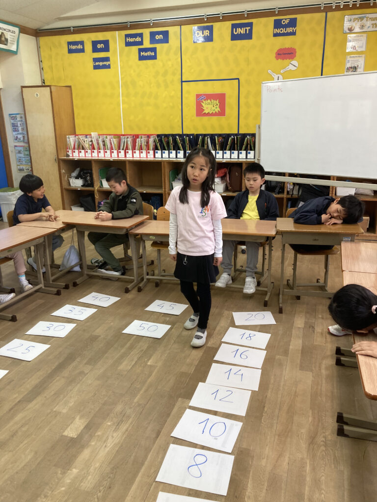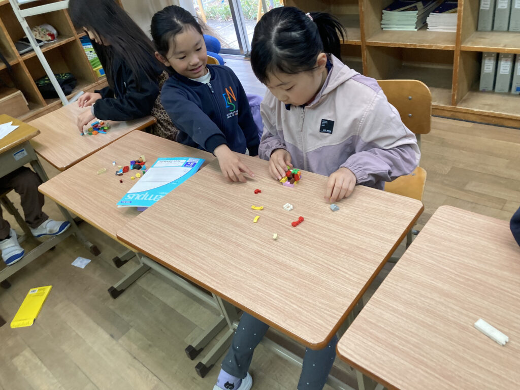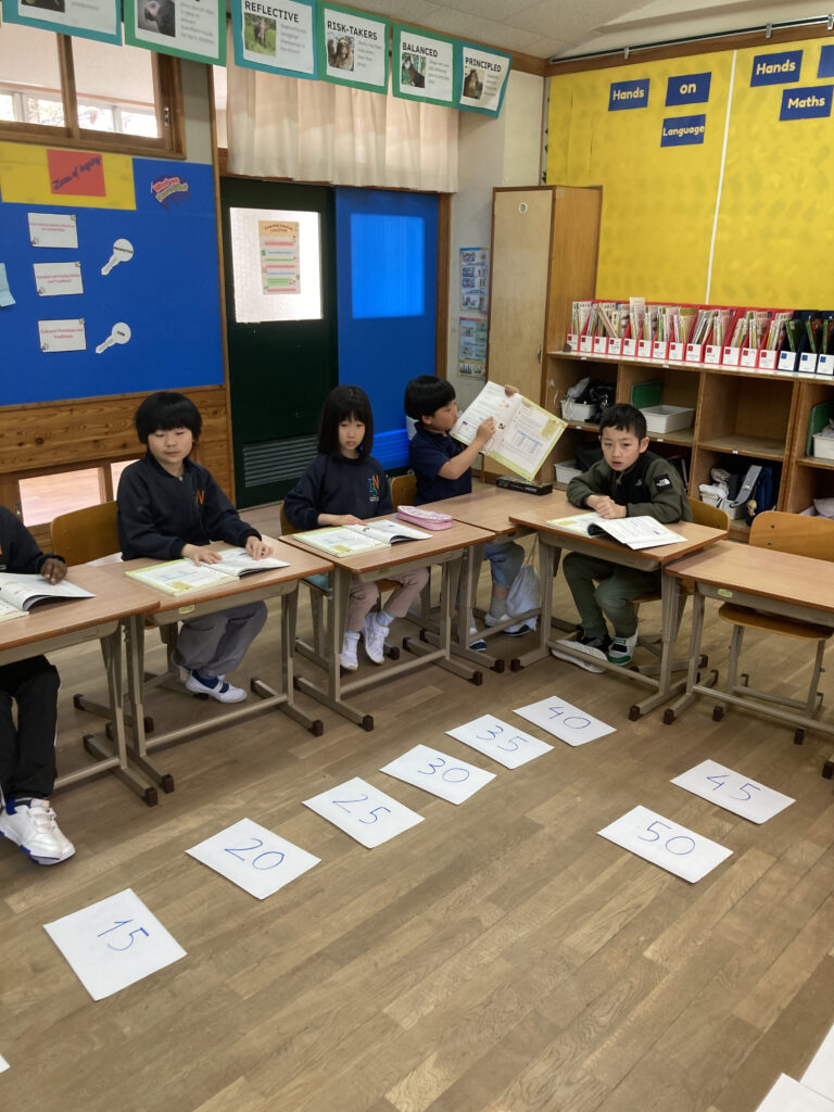 算数では、位取りと100の補数について、高い参加型かつ体験的なアプローチを通して探究してきました。単なる手順の習得にとどまらず、概念的理解を重視し、子どもたちがさまざまな方法で数を構成・表現・操作できるようにしています。これにより、数の仕組みや、数を柔軟に分解・再構成する考え方への理解が深まりました。また、異なる戦略に触れることで、数学的思考は一つの方法に限定されるものではなく、多様な視点からアプローチできることに気づいています。