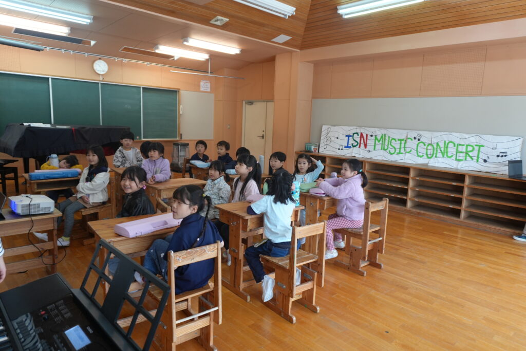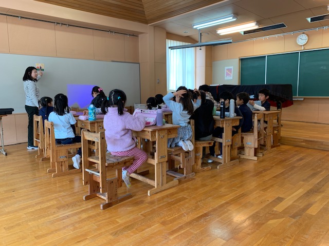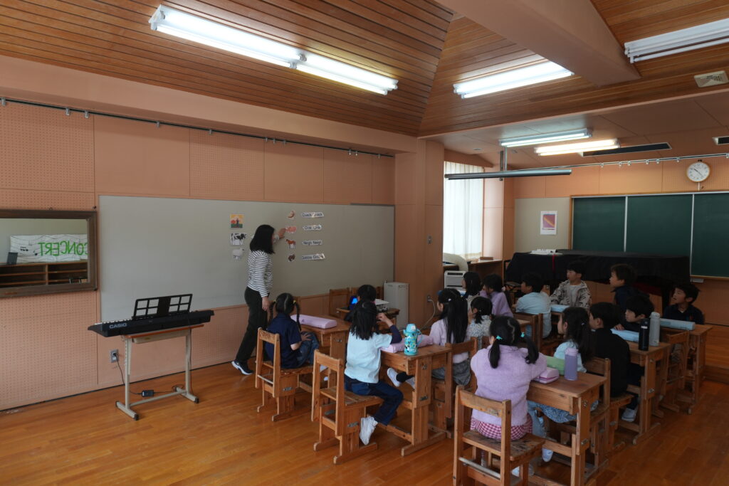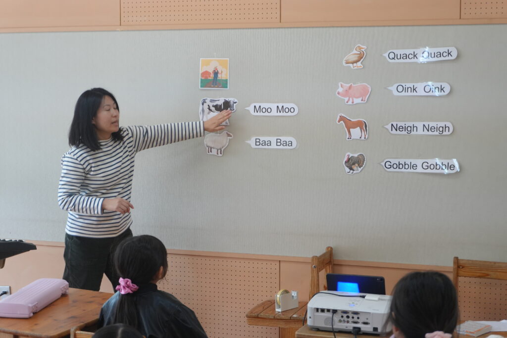 音楽の授業では、英語の定番の子どもの歌「Old McDonald(オールド・マクドナルド)」を学び、英語での動物の鳴き声にも触れました。