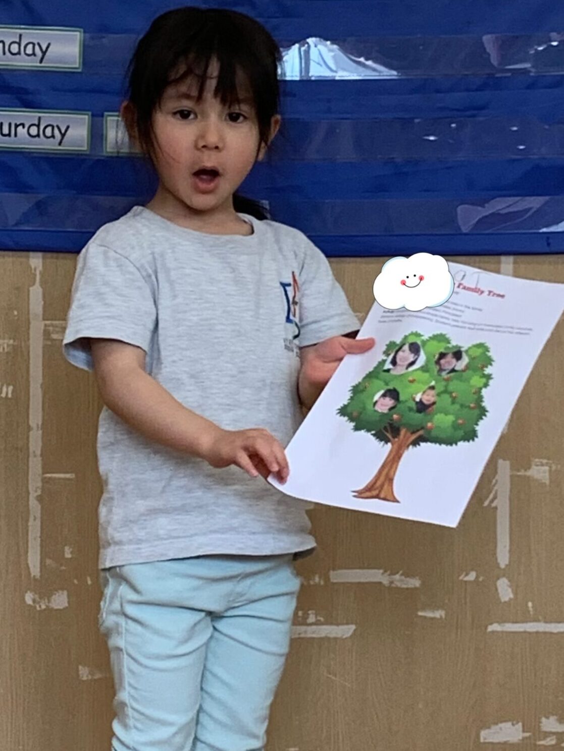 Shooting Starの子どもたちは、家族についての探究を続け、family tree(家系図)を作ることに取り組みました。それぞれの家族の写真を切り抜き、貼り付けていきました。自信と英語力をつけることを目的に、一人ずつ前に出て発表しました。進級してからクラスのみんなの前で発表するのは初めてでしたが、驚くことにみんなとても上手でした。ほとんどのShooting Starさんが上記の文章を自信を持って自分で言うことができました。よくできたね!🤩