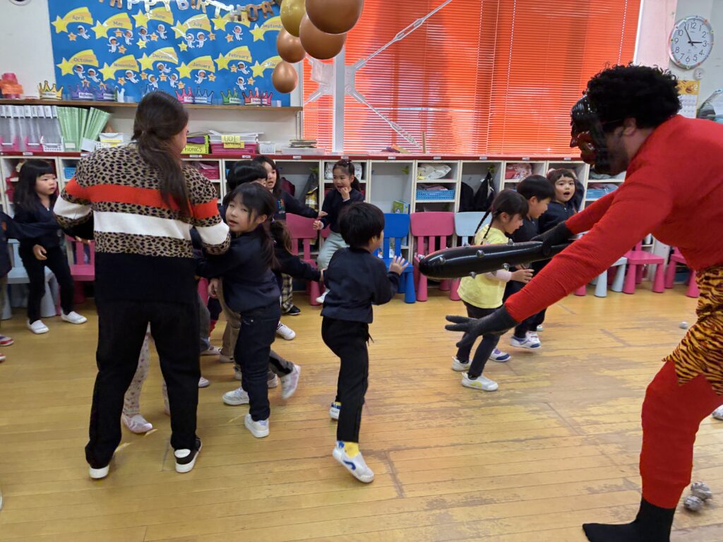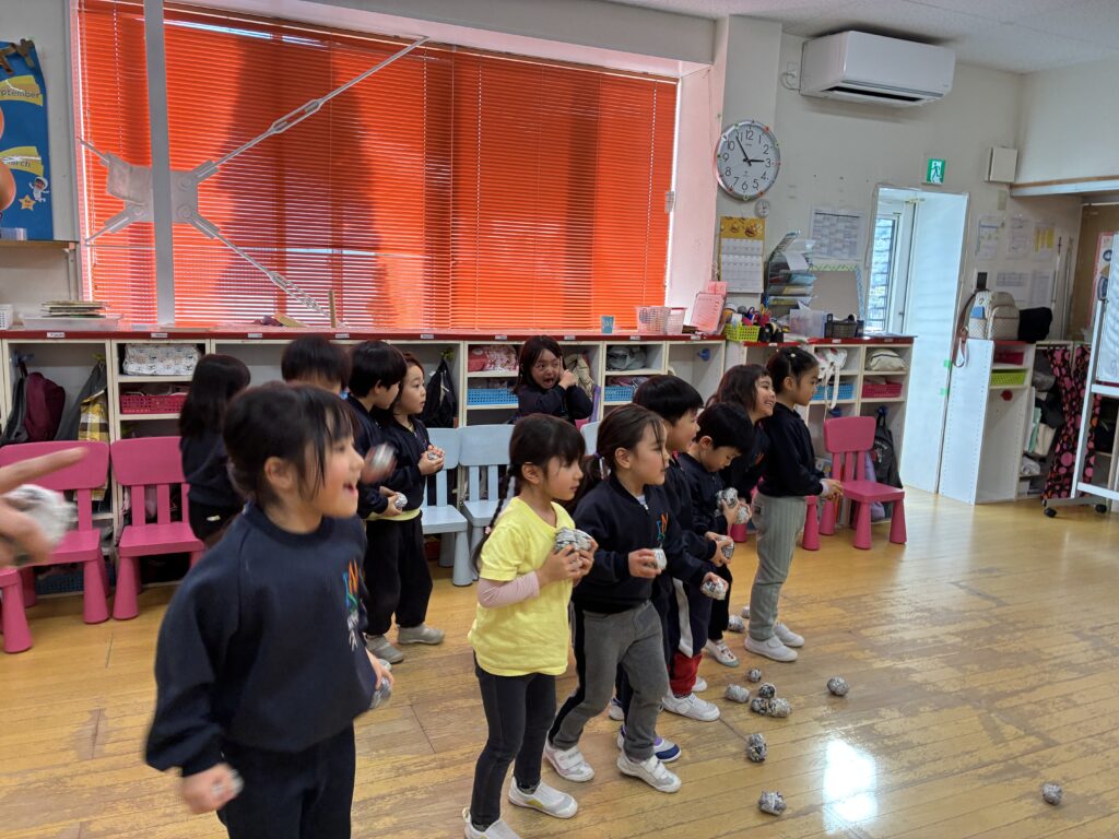 子どもたちは新聞紙ボールを手に取り、「鬼は外!福は内!」と元気に叫びながら投げました。少し怖くて泣いてしまった子もいましたが、多くの子どもたちはとても勇敢に、鬼に立ち向かっていました。