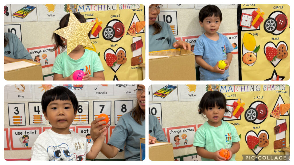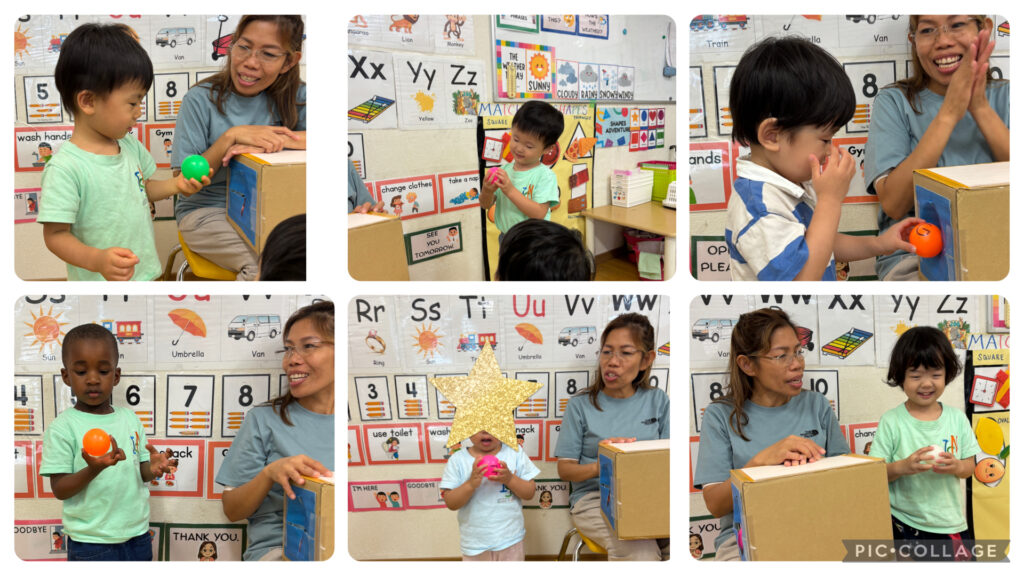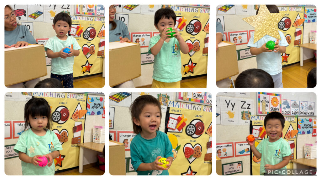 I took one ball out of the box and read the letters (A–H) aloud one by one. Since we sing the ABC song every morning during circle time, everyone has been able to remember them.