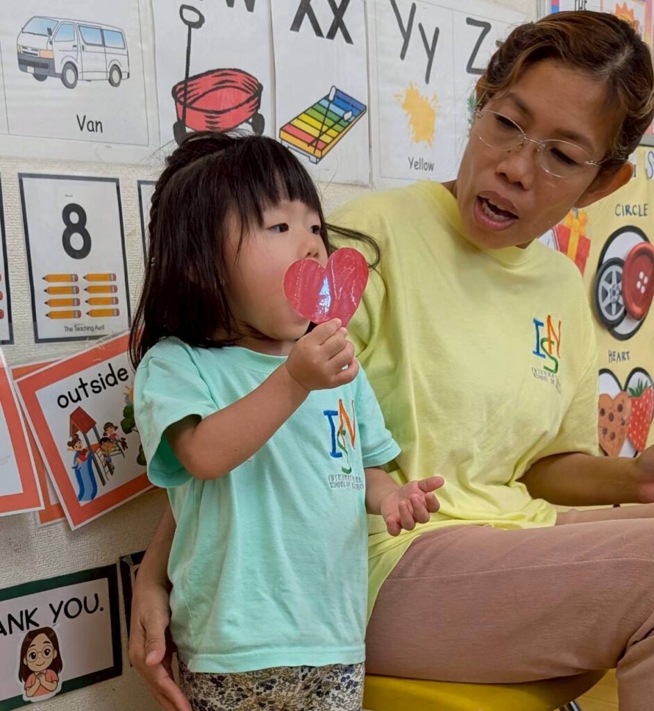 During snack time or lunch time, when I ask, “What shape is this?” the children answer, “Circle” or “Square.” In the morning free play, they enjoy puzzles with shapes like circles, squares, triangles, hearts, and stars.