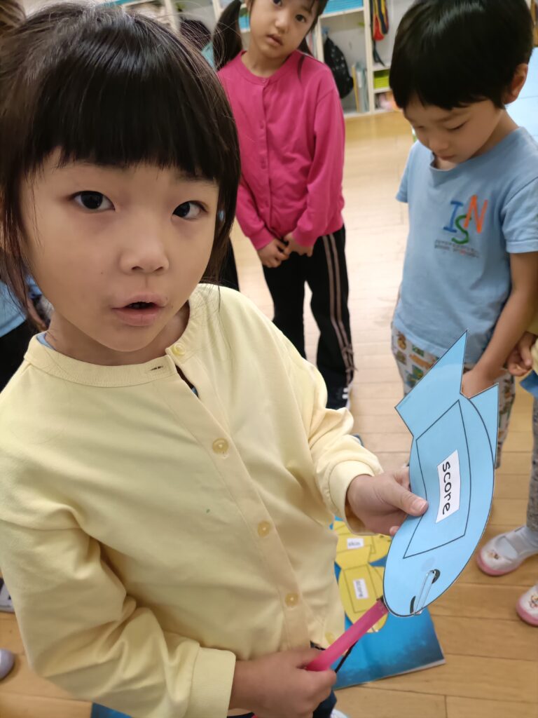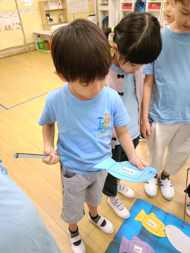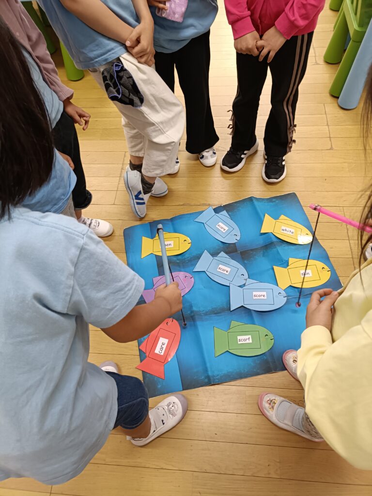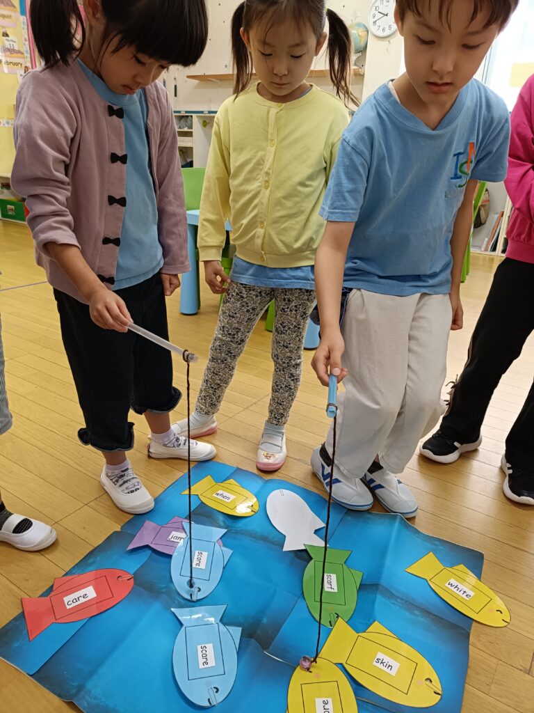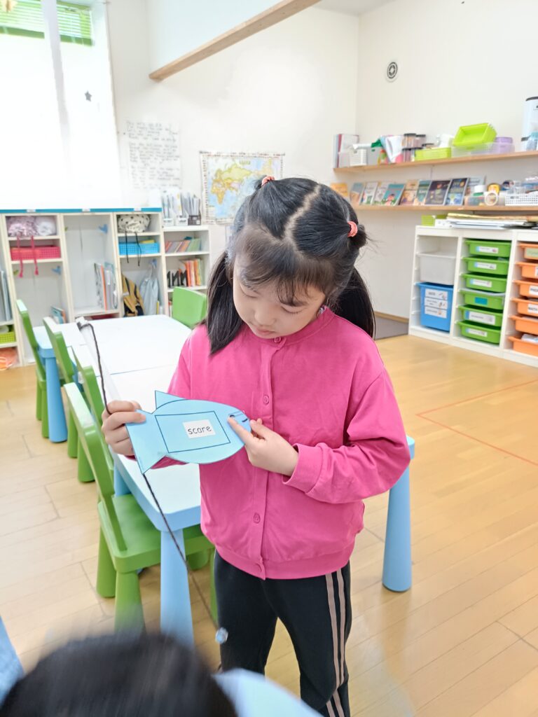 今週のフォニックスレッスンの目標は「sc」のダイアグラフでした。生徒たちはフォニックスの「ゴーフィッシュ」ゲームで、「sc」で始まる単語を当てました。目標の魚を釣り上げ、単語が読めた子はポイントを獲得。読めなかった子は正解するまで何度も挑戦しました。その後、ワークシートで「sc」の単語を切り取って、該当する絵の下に貼り付けるアクティビティをしました。