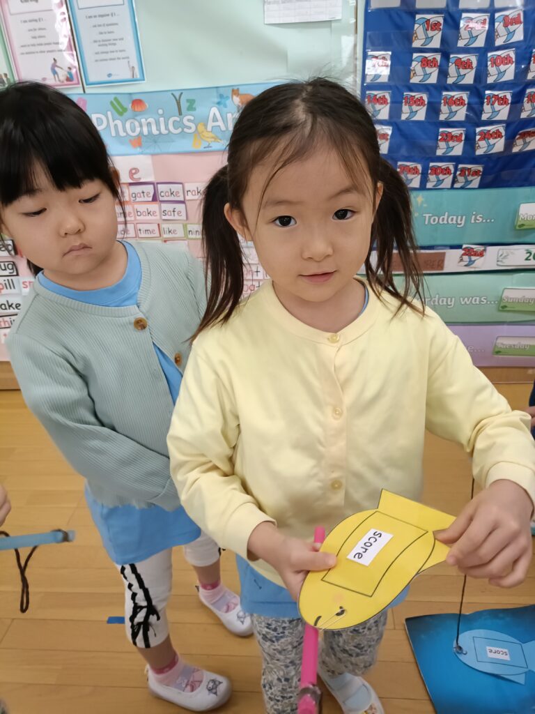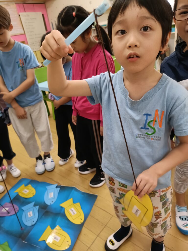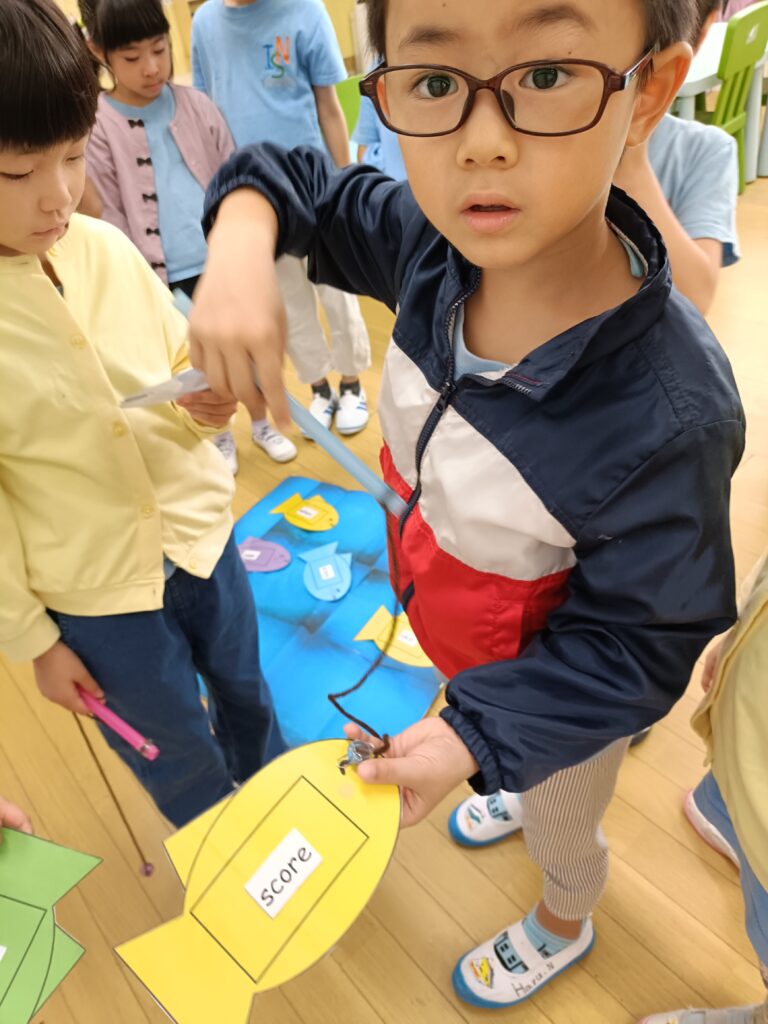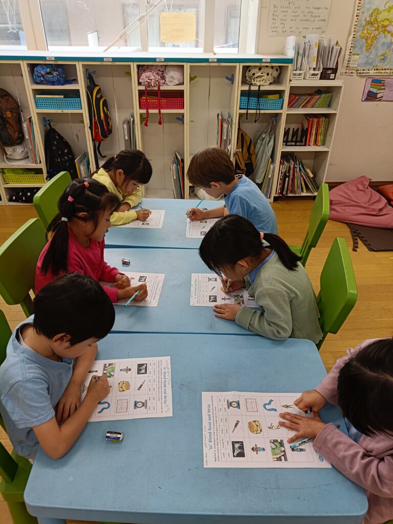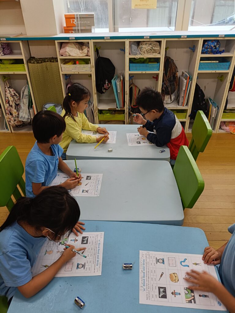 今週のフォニックスレッスンの目標は「sc」のダイアグラフでした。生徒たちはフォニックスの「ゴーフィッシュ」ゲームで、「sc」で始まる単語を当てました。目標の魚を釣り上げ、単語が読めた子はポイントを獲得。読めなかった子は正解するまで何度も挑戦しました。その後、ワークシートで「sc」の単語を切り取って、該当する絵の下に貼り付けるアクティビティをしました。