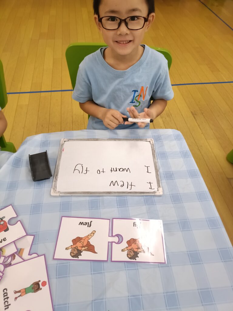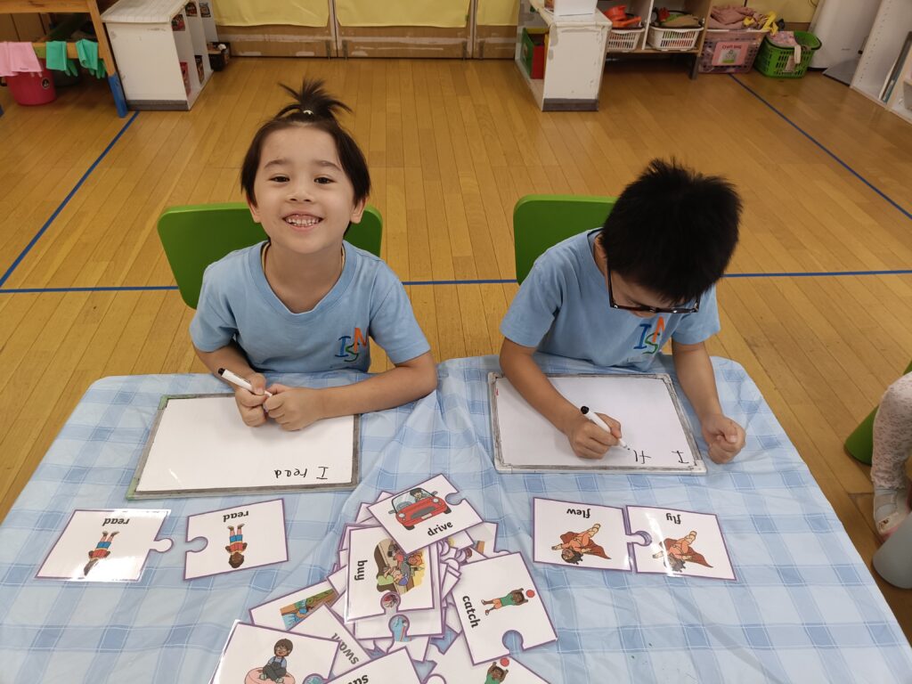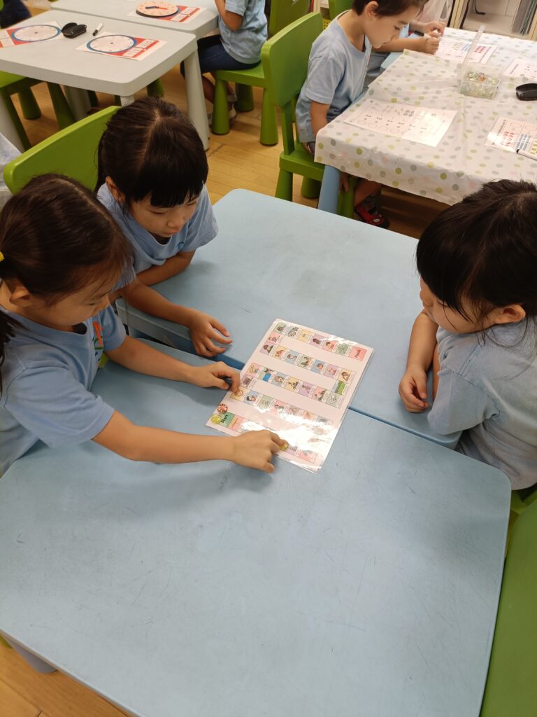 ワークステーションでは、時間の読み方、10 以内の数字の足し算と引き算、蛇とハシゴの質問をテーマにしたゲームでスピーキングスキルを磨くこと、現在形と過去形の単語を使用して文章を構成することなどを学習しました。