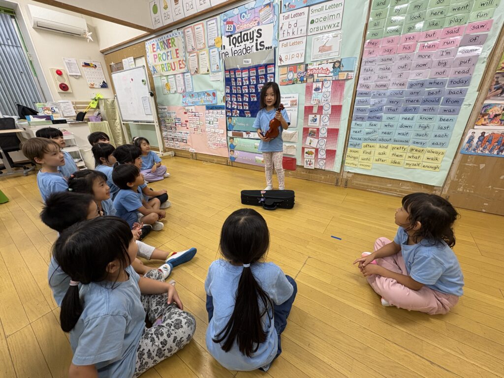 今週のショー・アンド・テルは、とても盛り上がりました!お友達の一人がバイオリンを弾いてくれました。みんな、彼女の才能に驚きました!お子さんが体操や楽器演奏(ギター、ドラム、カリンバなど)が好きなら、ぜひ学校に持ってきて、お友達に見せたり、演奏(プレゼン)したりさせてあげてください!こうした経験は、お子さんの自信を高める良い機会になるでしょう。