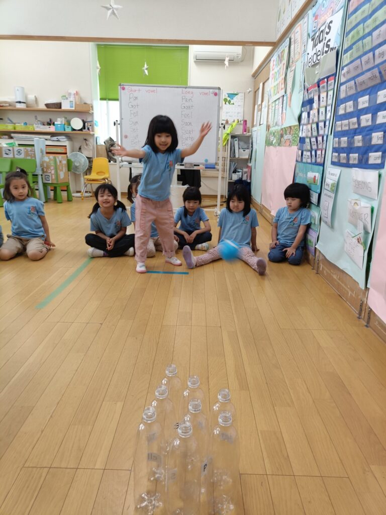 フォニックスでは長母音について学び、今月の残りの期間は、生徒が短母音と長母音を区別できるように指導することに専念します。楽しくフォニックスを学んでもらえるよう、ペットボトルを使ったボーリングゲームをしました。倒したペットボトルに書かれた単語を読み、ホワイトボードに書かれた短母音の単語と一致させるというゲームです。