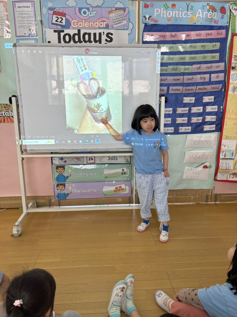 お父さんお母さんが家で撮ってくれた「再利用」に関する写真について、それぞれ短いプレゼンテーションを行いました。これらの写真は紙に印刷しませんでした。それは無駄を作らないこと(本当に必要ない時に材料を使うことを減らすこと)をみんなに理解してもらうためです。今週学んだことをまとめるために、再利用できるものとできないものを分別するワークシートに取り組みました。また、自分の答えの理由を説明してもらいました。