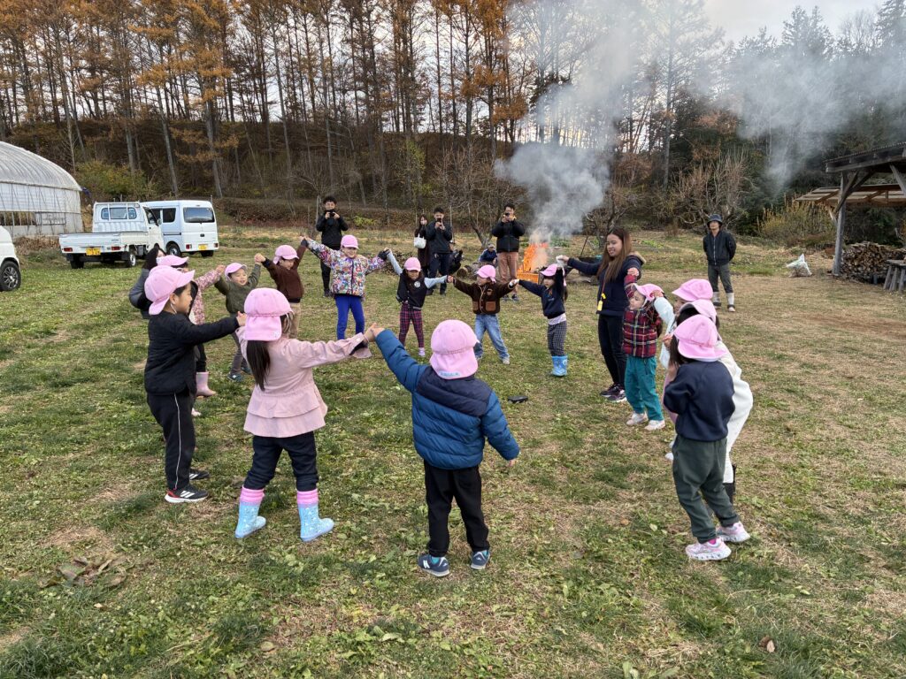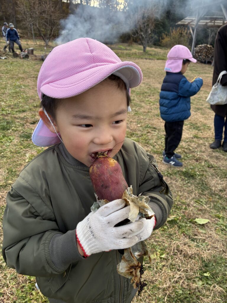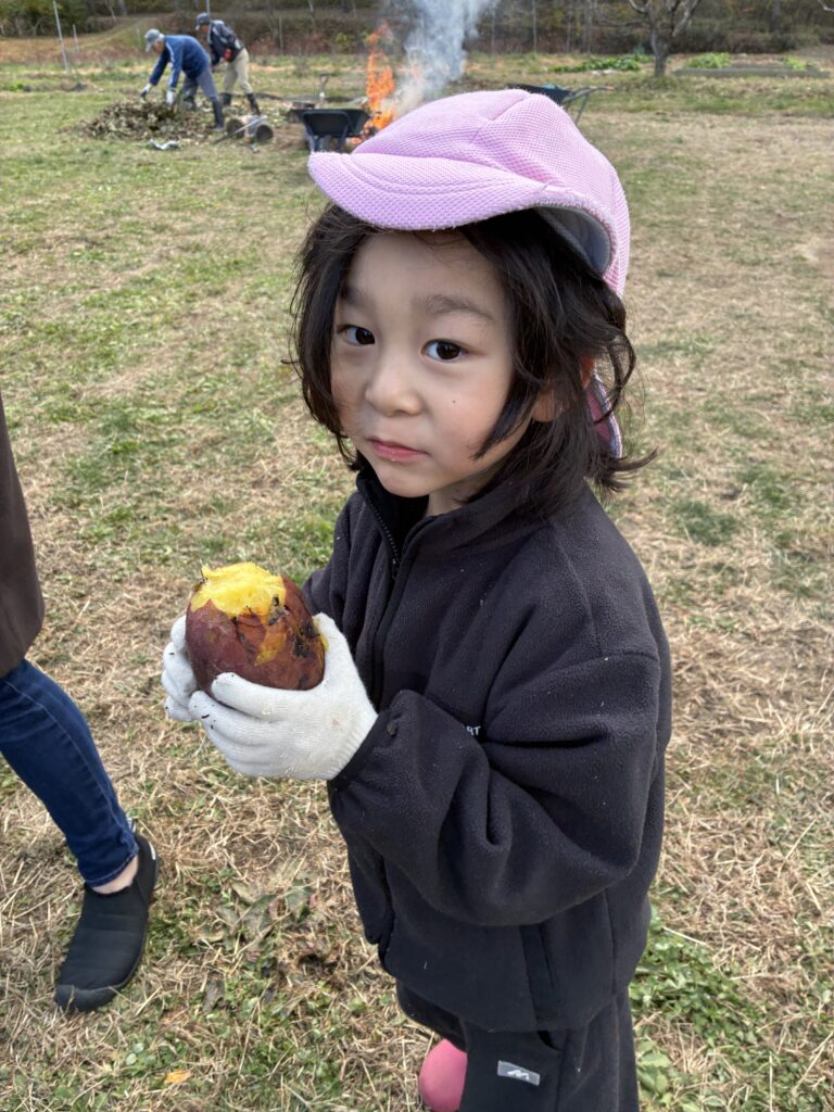 そして週の締めくくりは、心温まる特別なイベント——小山さんの畑での「焼きいもパーティー」でした!今年はご家族にも参加していただき、秋の恒例行事がさらに特別なものになりました。子どもたちは、濡らした新聞紙とアルミホイルでさつまいもを包み、焼けるのをわくわくしながら待ちました。待っている間は、自然の中でお父さん・お母さん、友だちと楽しく遊ぶ姿が見られました。焼きいもの前には、子どもたちからの心のこもったプレゼントとして、「Yesterday’s Dream」を披露しました。とても温かく、記憶に残るひとときとなりました。