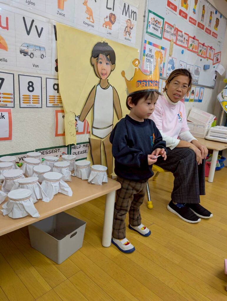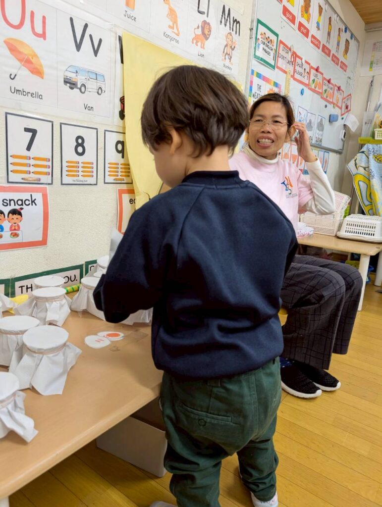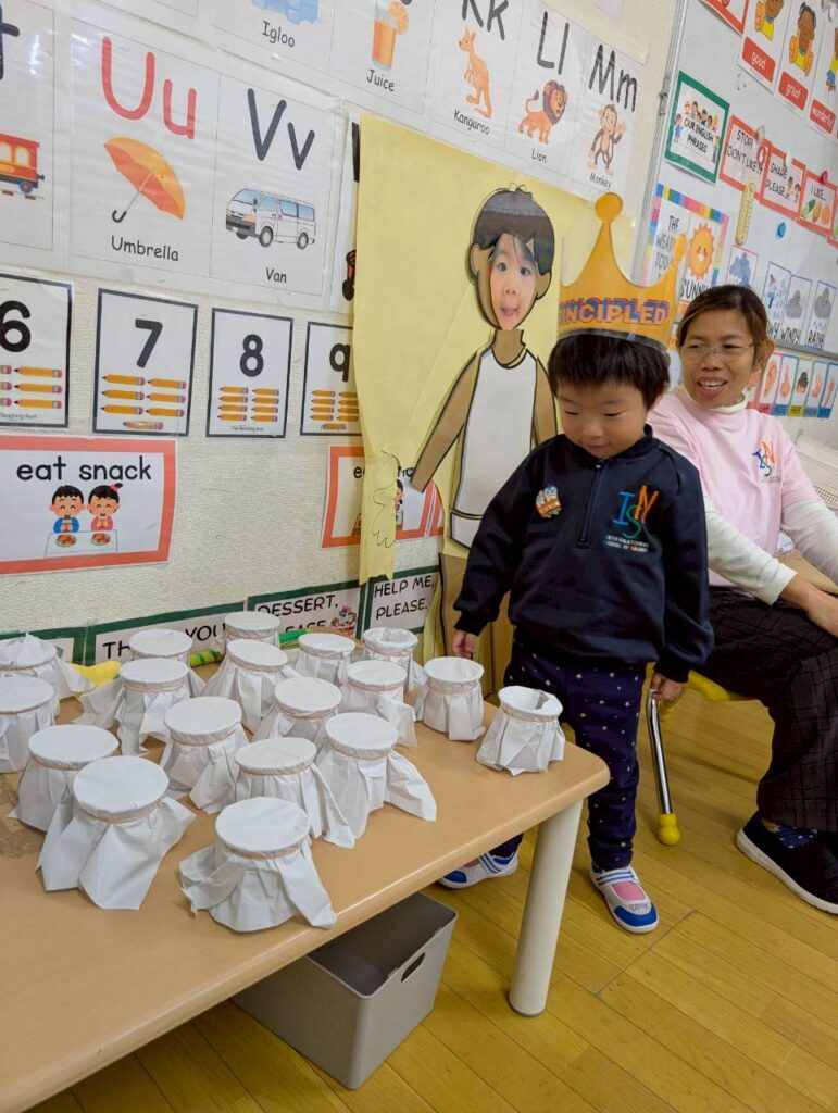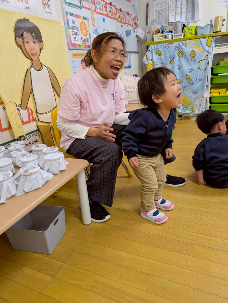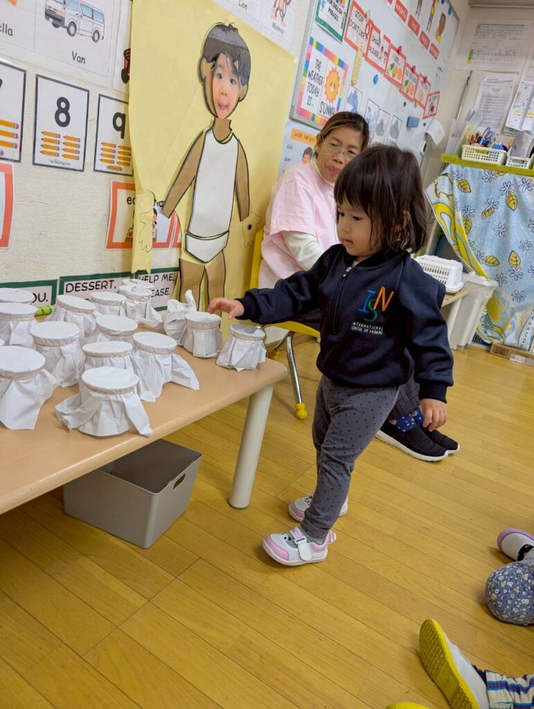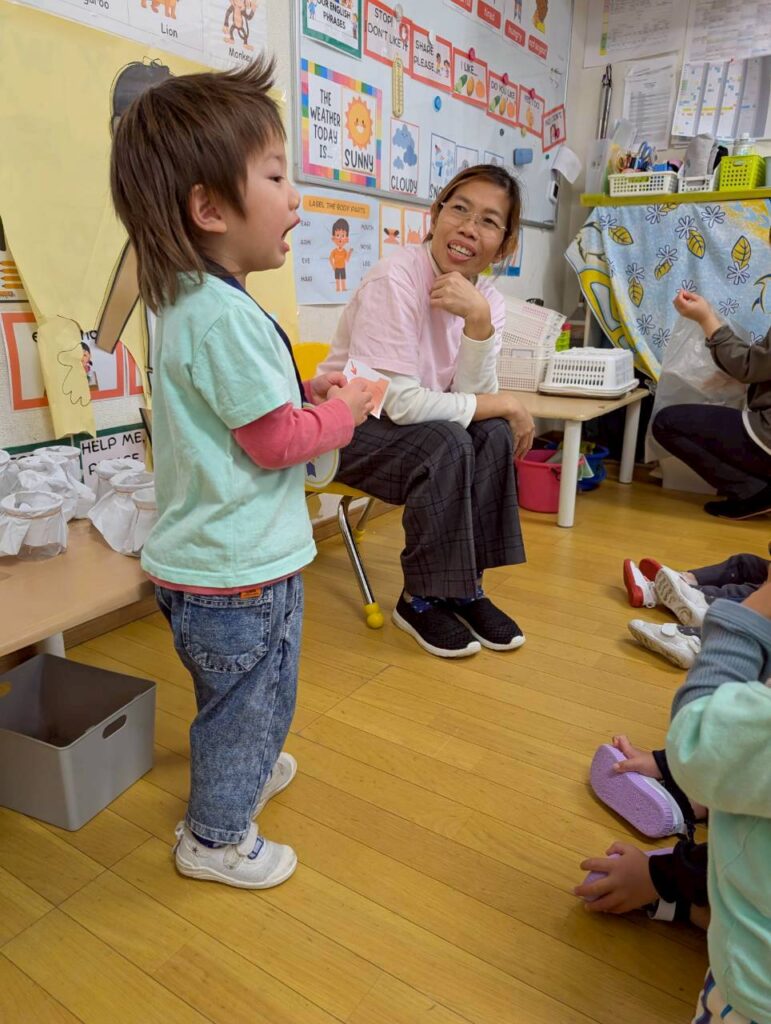 This month’s topic was “Body Parts.” The Rainbows learned that there are many parts and names for the body, such as head, arms, knees, and toes, and they quickly memorized the English names of them. This week, the activity that Ms. Marlyn prepared for our children was for them to choose their favorite cup from a number of cups covered in paper, tear the paper, and show and tell the class the name of a body part drowns on a card inside. It was so much fun; everyone couldn’t wait for their turn (lol). They also enjoyed singing and dancing related to the body parts.