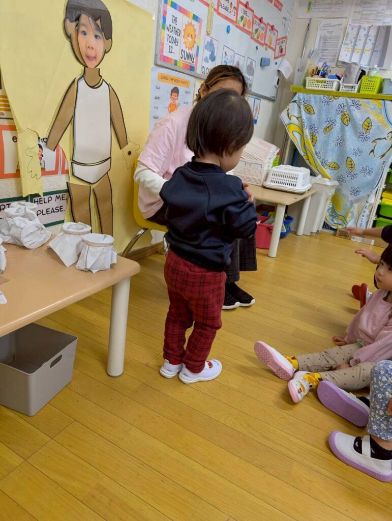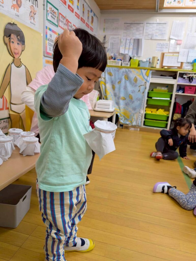 今月のトピックは「ボディーパーツ(身体の部位)」でした。頭、腕、膝、つま先などなど・・・体には多くの部位と名前がある事を知り、英語の表現もあっと言う間に覚えてしまうレインボー達でした。今週、マーリン先生が用意してくれたアクティビティーは、紙で覆われた沢山のカップの中から好きなカップを選び、紙を破って中のカードに書かれた体の部位の名称をクラスの前で発表するものでした。楽しくて、みんな自分の順番が来るのが待ちきれない様子でした(笑)。 また、身体に関連する歌や踊りも楽しみました。