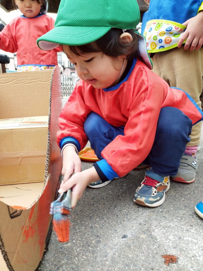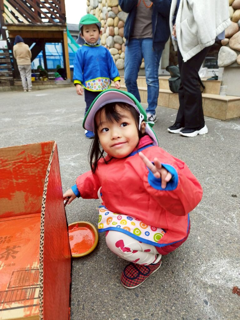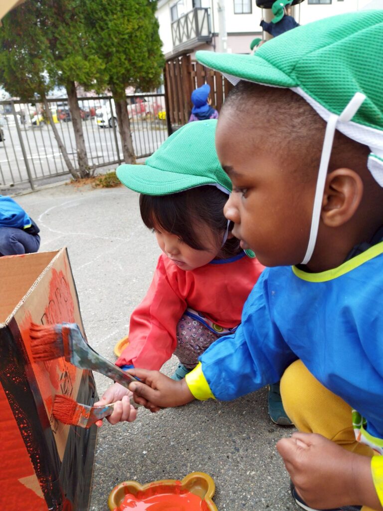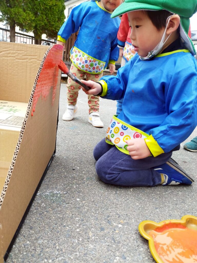 園庭に出てサンタのソリにみんなで色を塗りました。みんなで色を決めた後、順番に筆を取り、絵具を塗りました。素敵な色のソリが完成しました。サンタさん、乗り物(ソリ)の用意ができましたよ!私達のところにも来てね!