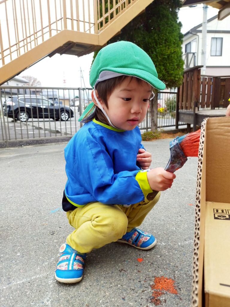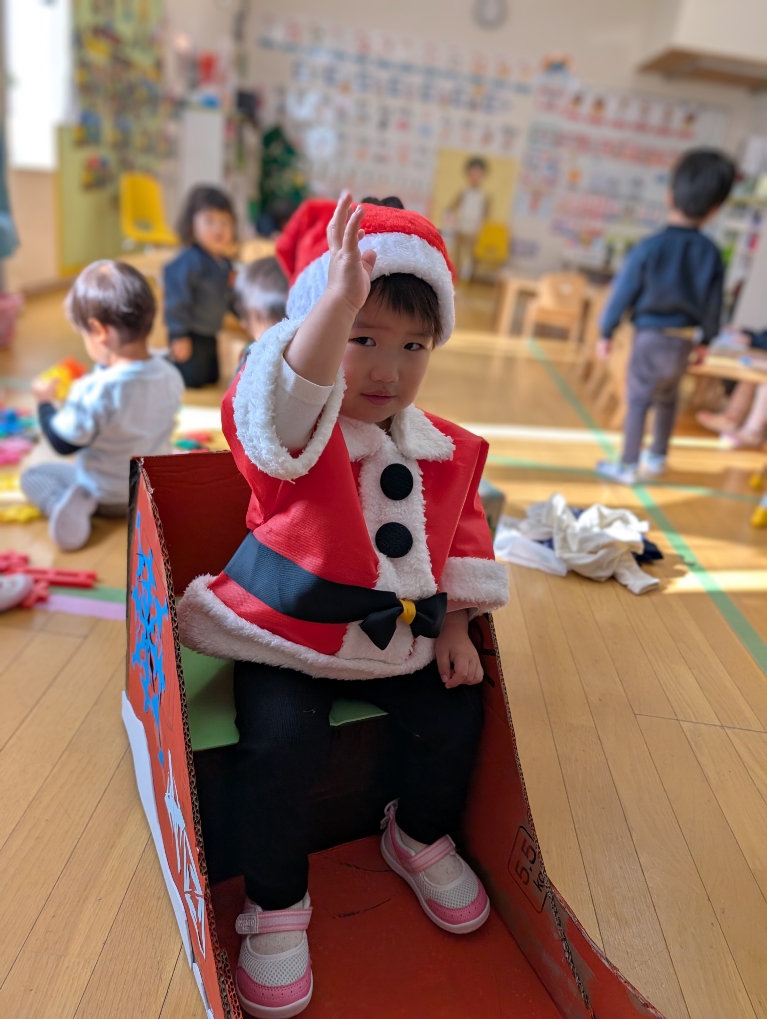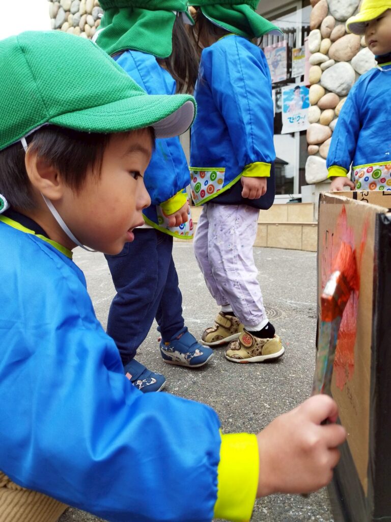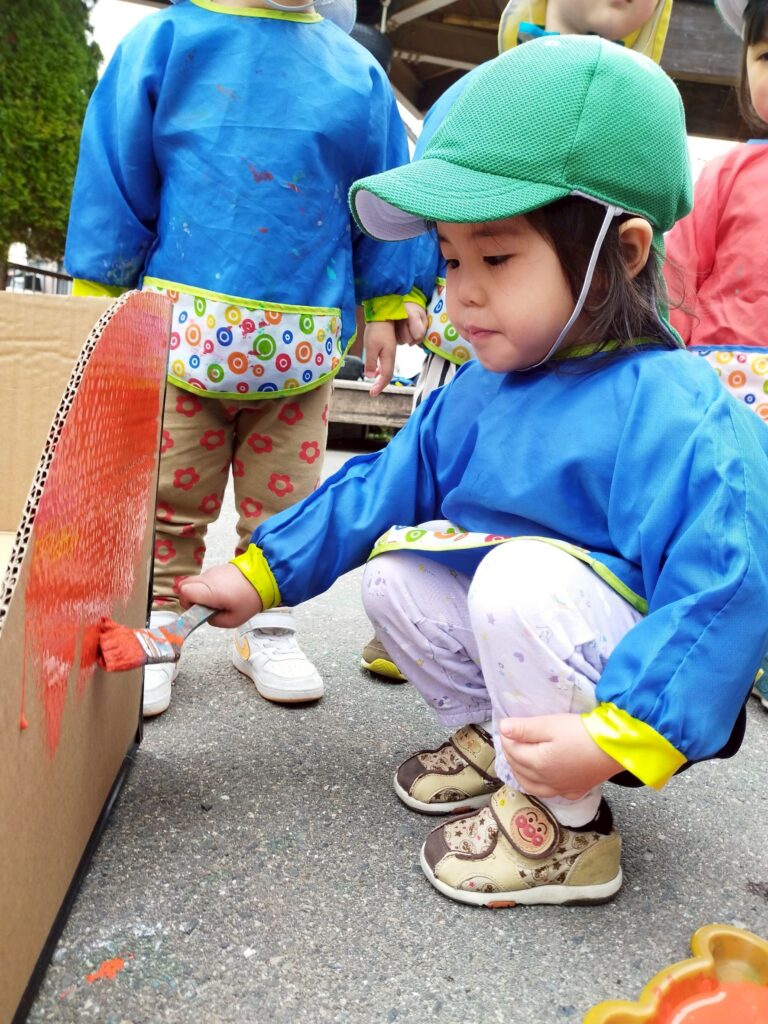 園庭に出てサンタのソリにみんなで色を塗りました。みんなで色を決めた後、順番に筆を取り、絵具を塗りました。素敵な色のソリが完成しました。サンタさん、乗り物(ソリ)の用意ができましたよ!私達のところにも来てね!