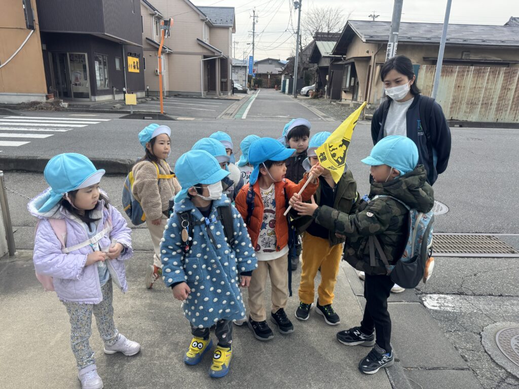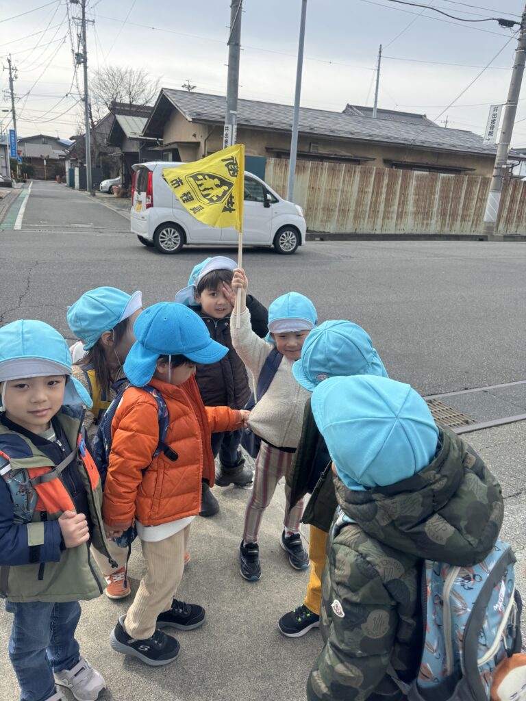 地域散策に出かけ、道路標識を観察しながらその重要性や安全確保の役割についても話し合いました。また、安全旗を使って実際に道路を安全に渡る練習もしました。子どもたちは、歩行者をドライバーに目立たせるための旗の目的を学び、渡りながら旗の正しい持ち方や使い方を練習しました。これにより、旗が安全な横断を支える仕組みを理解できました。道沿いに多くの標識を見かけ、その意味を理解しました。バス停での安全な待ち方やバスの乗車ルールについても話し合いました。最後に、バス停に掲示されている時刻表の意味も学びました。