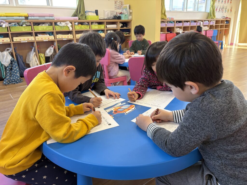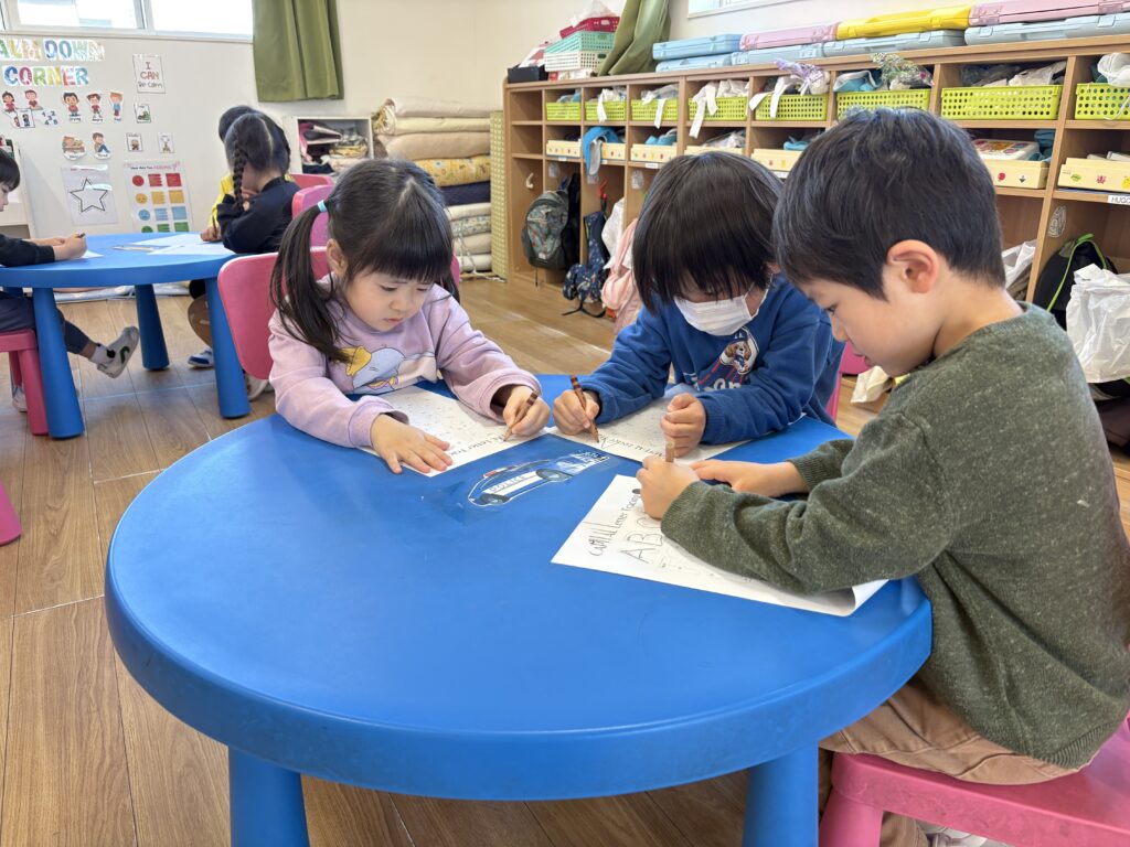 フォニックスの時間では、アルファベットの音を確認し、数字を正しい順番で認識して書く練習をしました。正しい書き方に注意し、時間をかけてきれいに書くことに重点を置きました。