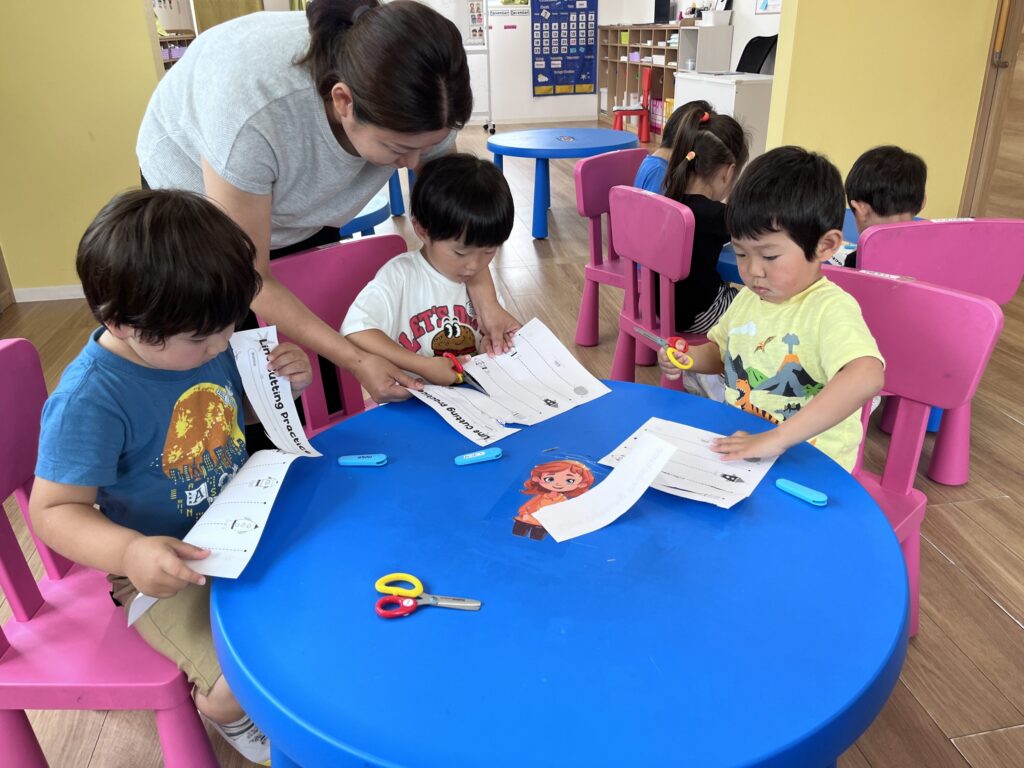 オーロラさんは、ハサミを正しく持って紙を切る練習をしました。活動を始める前に、ハサミを安全に使うためのお約束とルールを話し合いました。