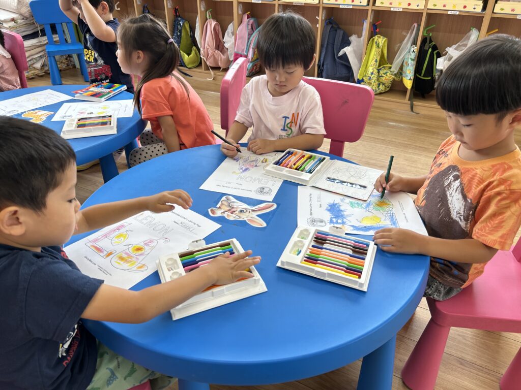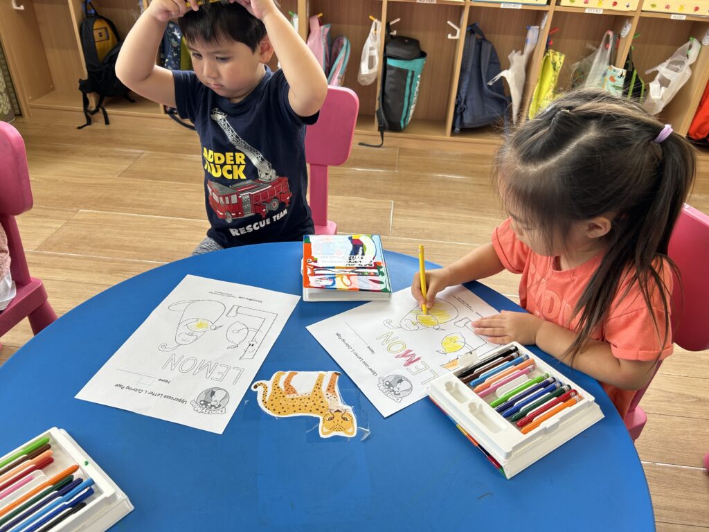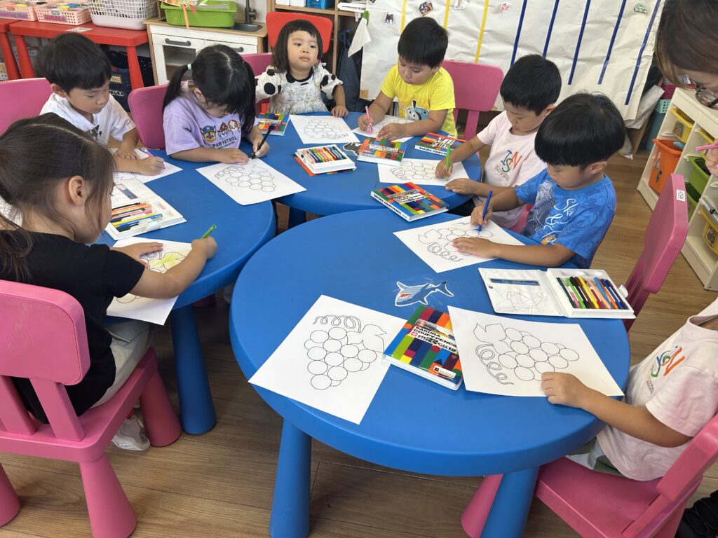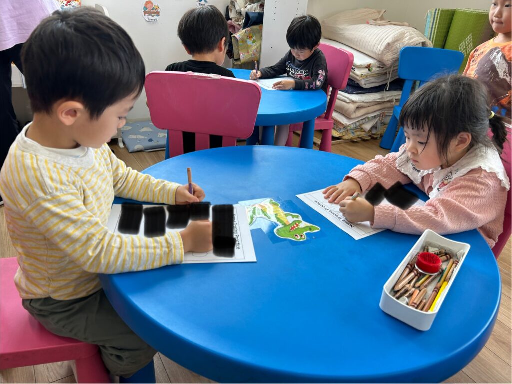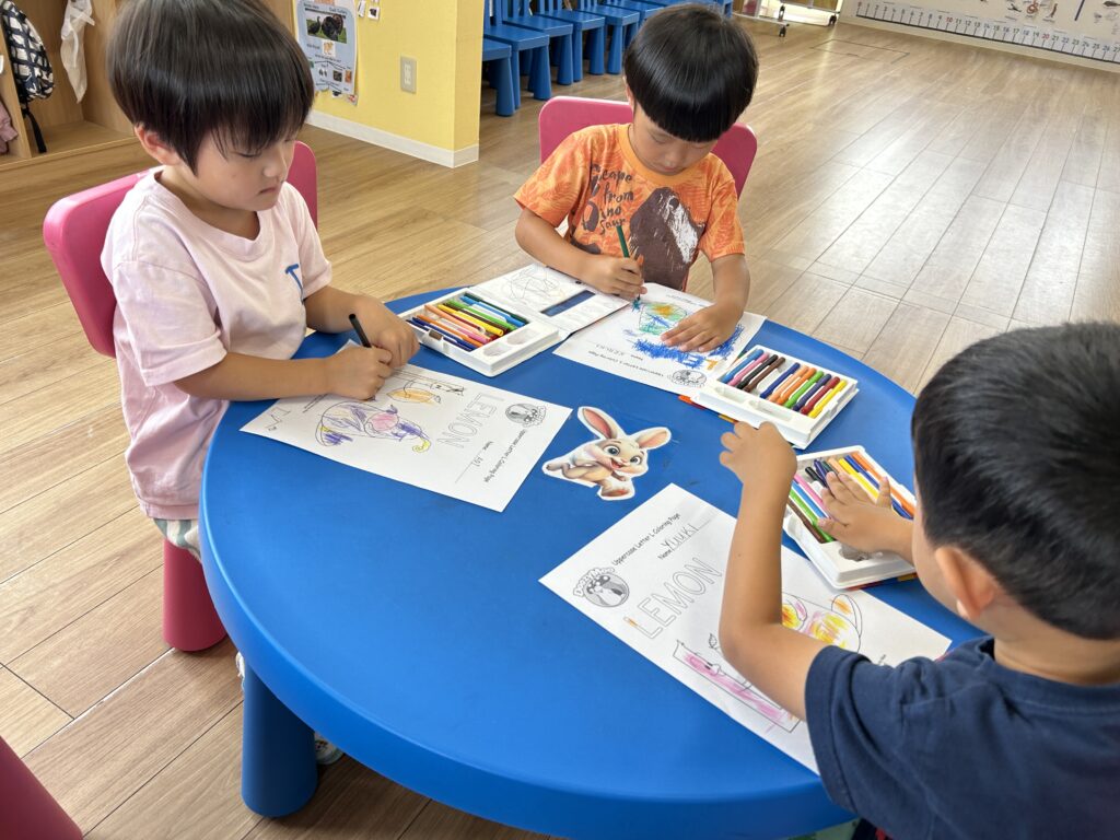 今週は、文字「L」の塗り絵となぞり書きに取り組みました。前月と比べて色を鮮やかで整然と塗るなど、著しい進歩が見られ、集中力と細かい運動能力の成長が伺えます。また、正しい筆順に注意しながら名前を書く練習も行いました。文字を順番に書くことにまだ取り組んでいる子もいますが、指導と練習を重ねることで着実に上達しています。