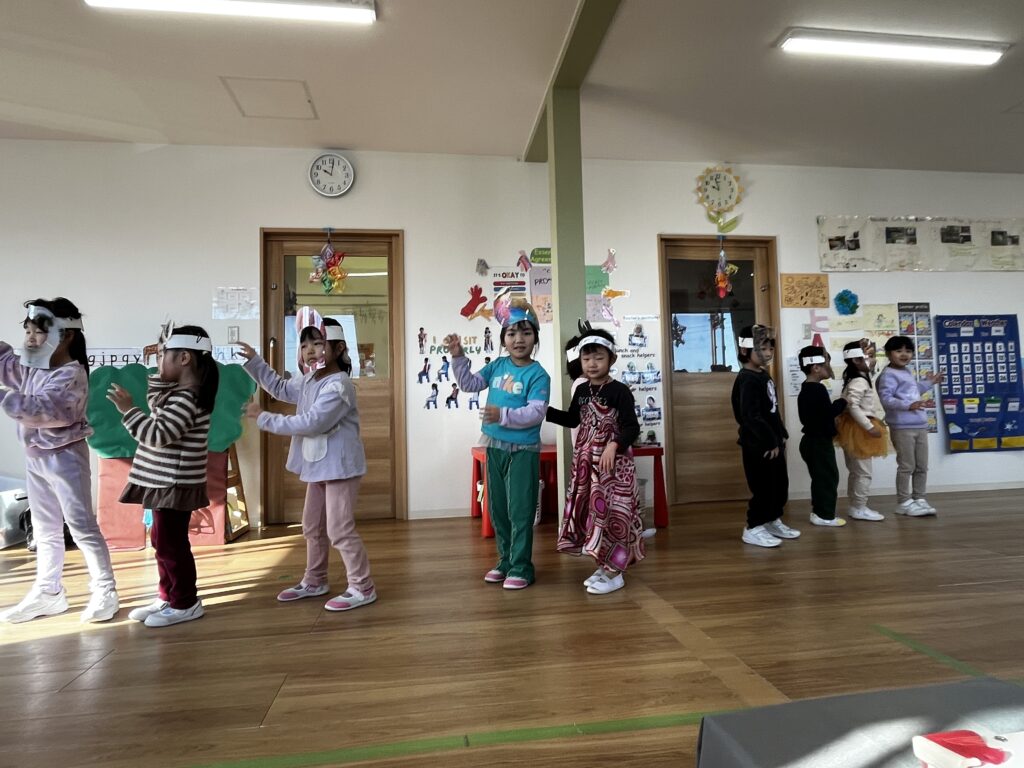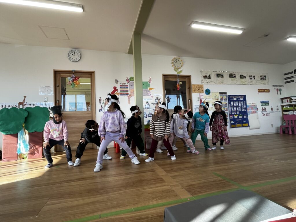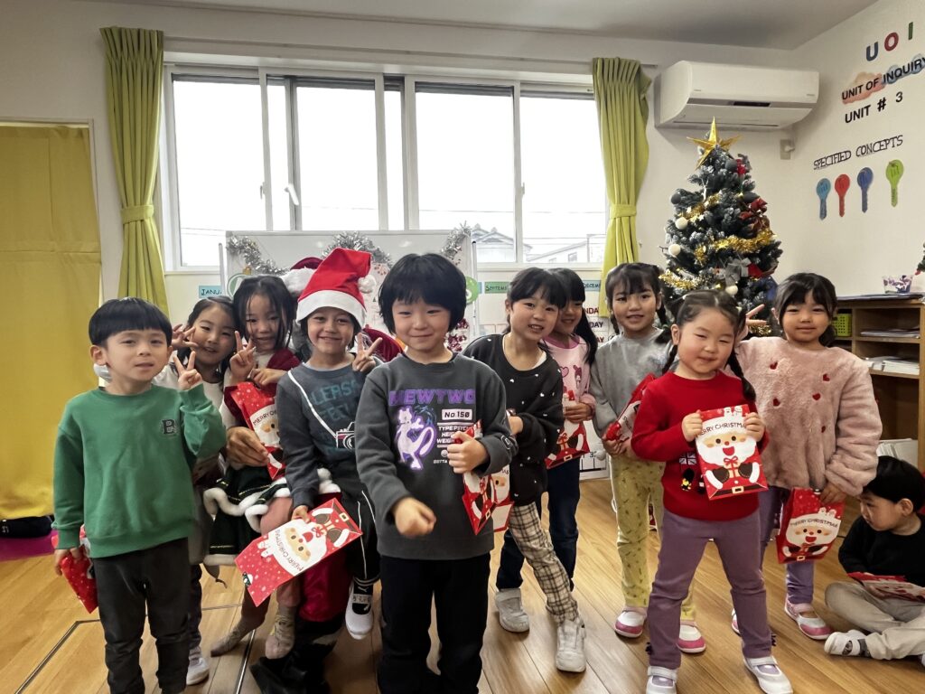 レインボークラス、オーロラクラス、シューティングスタークラスのお友達と、スペシャルゲストもお迎えして、楽しいクリスマスパーティーを開催しました。「ジングルベル」と「サンタが街にやってくる」を歌ってスタートしました。