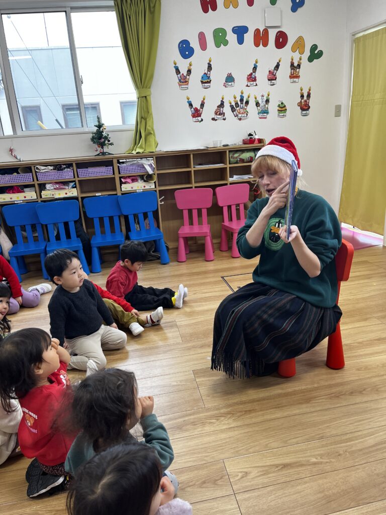 次に、先生が「クリスマスの松」のお話を読み聞かせてくれました。子どもたちは一緒に楽しく聞きました。その後は、クリスマス・スカベンジャーハントをしました。子どもたちはゲストと一緒に、黒板に書かれたクリスマスのアイテムを探し回りました。