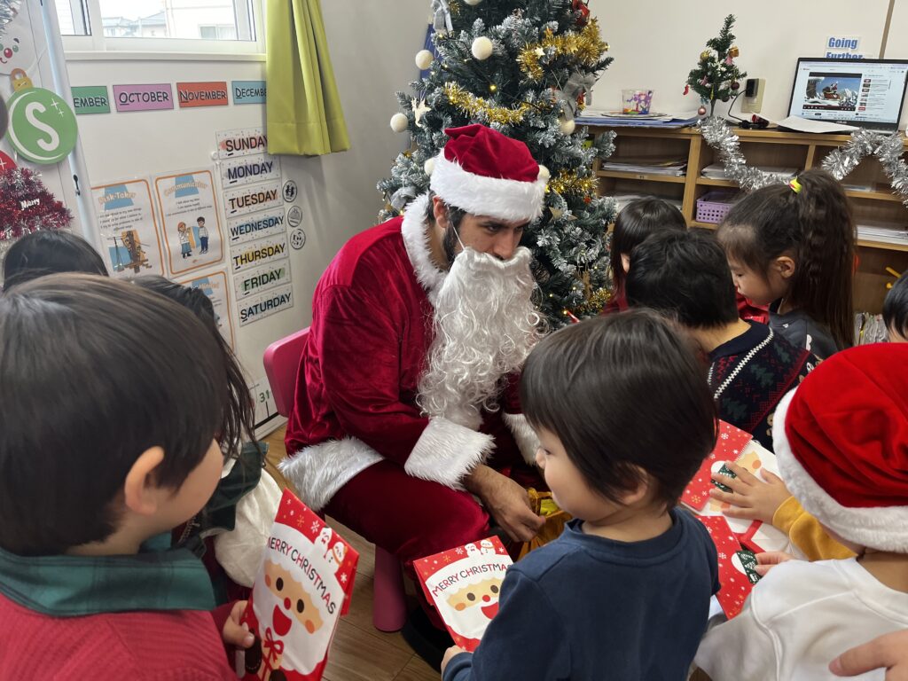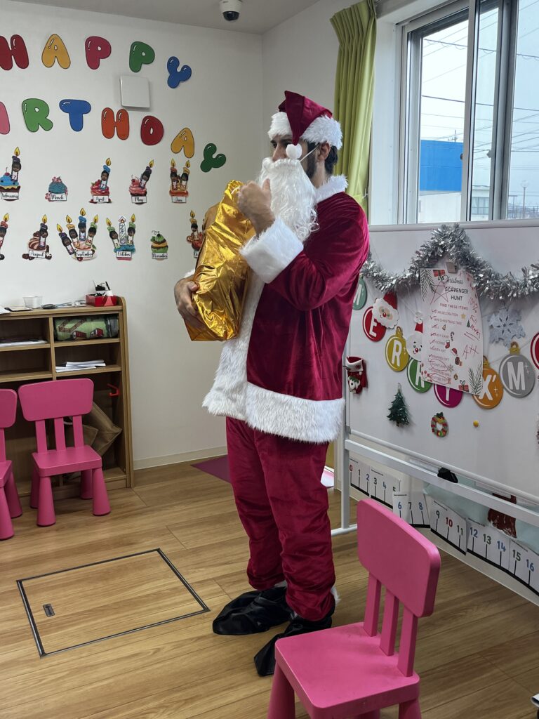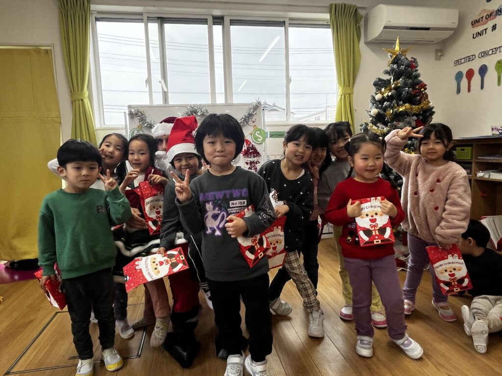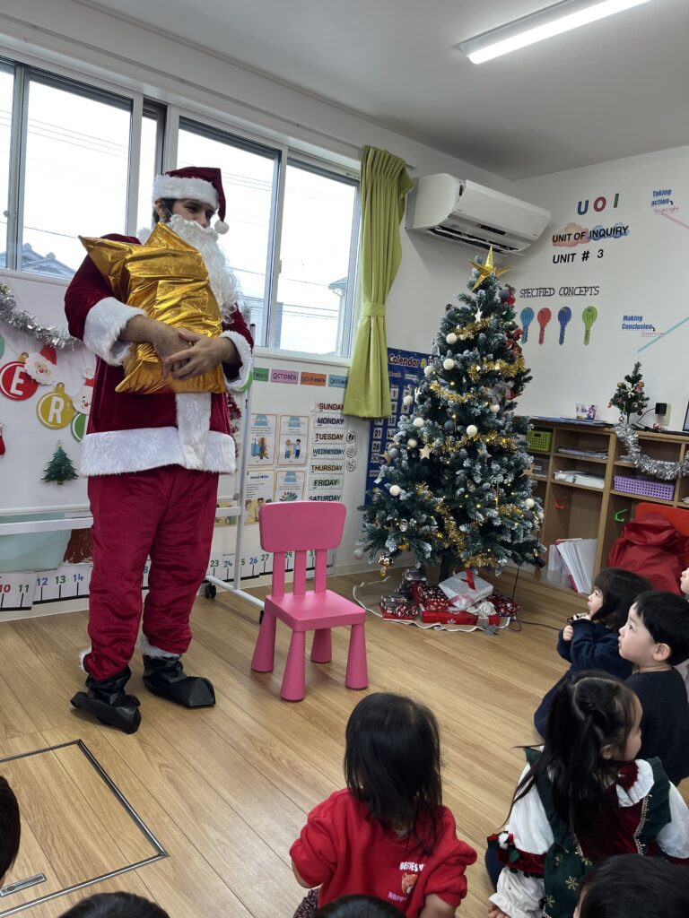 サンタクロースが登場すると、さらに興奮が高まりました!サンタクロースは子どもたちにプレゼントを渡し、みんなで一緒に写真を撮ることができました。最後に、先生が「フェリス・ナビダッド」を歌って、パーティーは終わりました。
