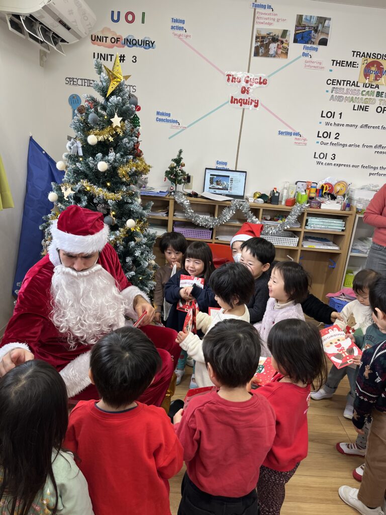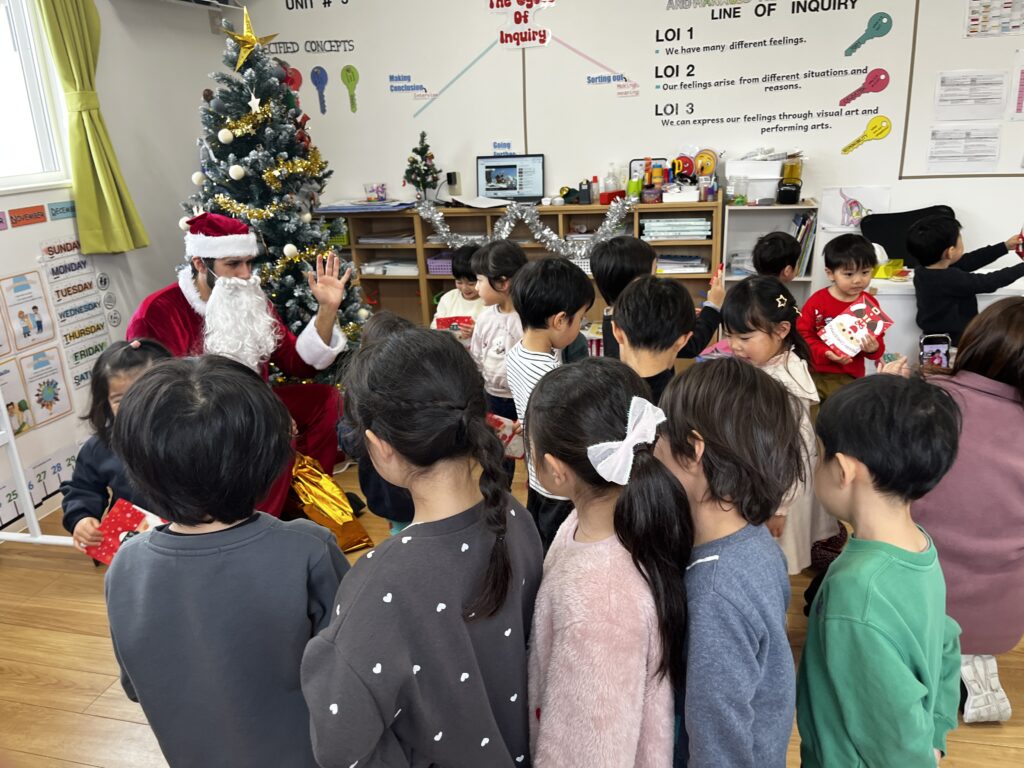 We had a fun and joyful Christmas party with the Rainbow, Aurora, and Shooting Star classes, along with some special guests. We started by singing “Jingle Bells” and “Santa Claus Is Coming to Town.”