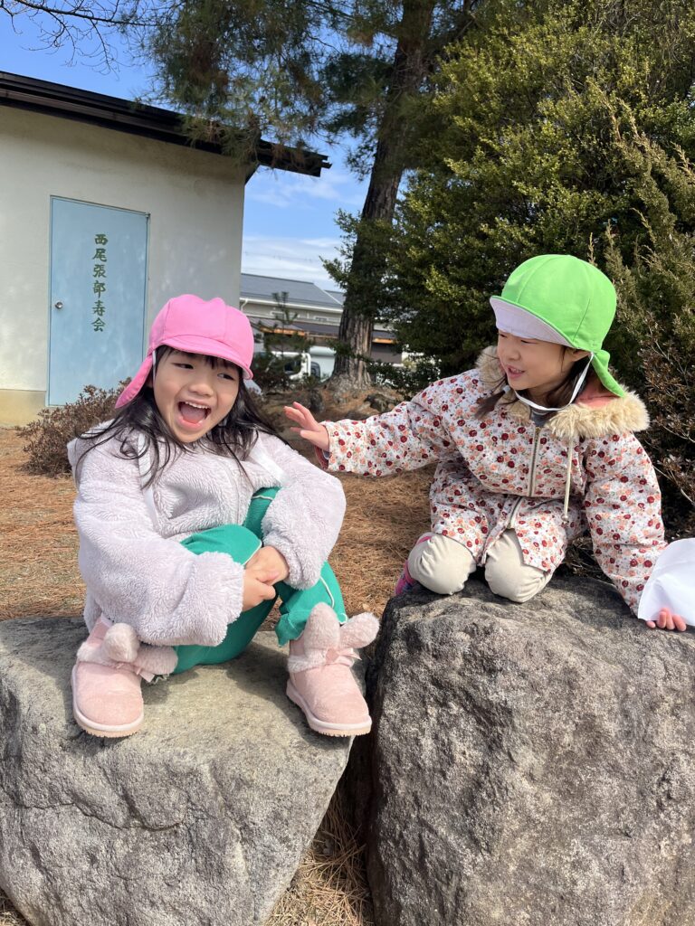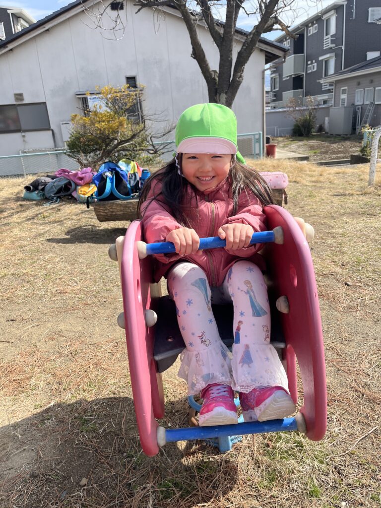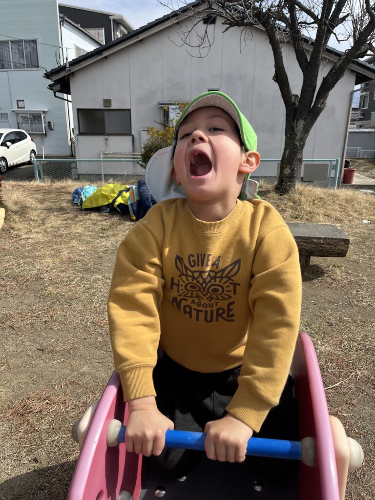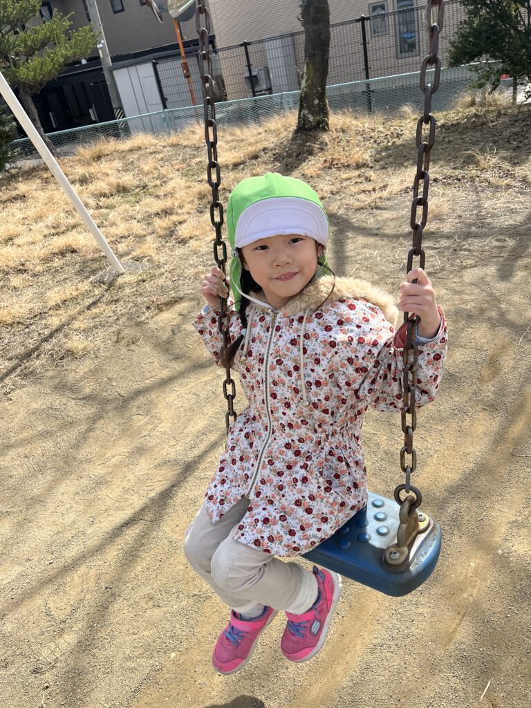 この日の一番のお気に入りのアクティビティの一つは、ブランコ遊びでした。子どもたちは順番に高くブランコに乗り、友達と笑い合いました。また、走り回ったり、木々を観察したり、周りの自然の小さな不思議に気づいたりもしました。