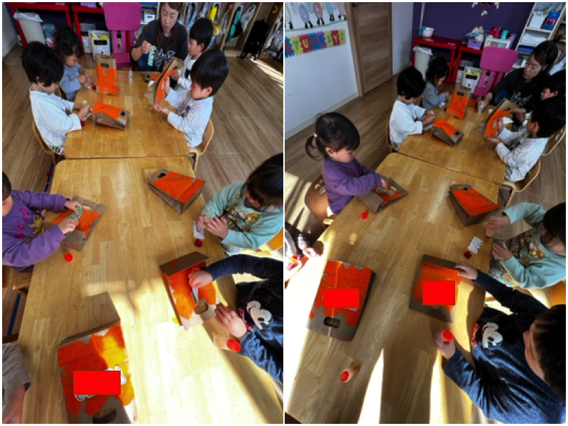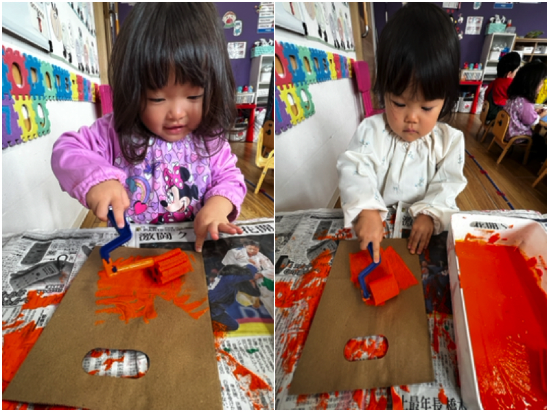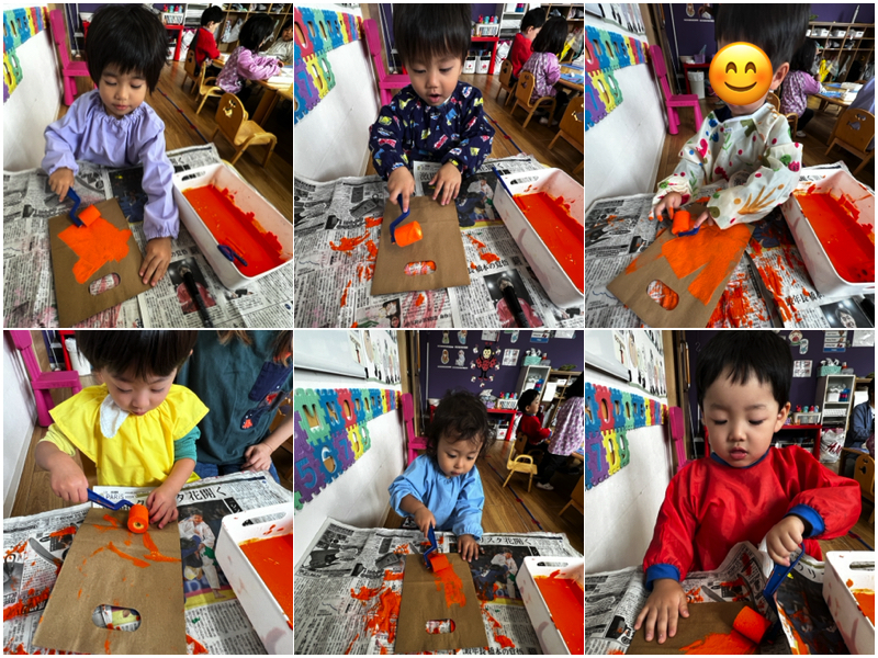 今月10月の大きなイベント、もちろんハロウィン🎃👻の準備で忙しい毎日です。ハロウィンが待ちきれず、子どもたちは毎日ハロウィンダンスの練習に励んでいます。イベントに必要なものの準備や手作りにも大忙し。トリックオアトリート用のバッグはもう完成。オレンジ色に塗って目と口を描き、ジャック・オ・ランタンのバッグに仕上げました。さらに、各自の名前を書き加えて自分だけのバッグに仕上げました。バッグ作りでは、子どもたちに「自分の名前の最初の文字は何?」と問いかけ、テーブルに並べられた名前の文字の中から探させるという挑戦を課しました。驚くべきことに、ほとんどの子どもが自分の名前の最初の文字を答えられました。また、自分の名前を構成する他の文字や綴りを何となく認識できる子もいました。仲間の名前を知っている子も何人かいました。すごいですね!