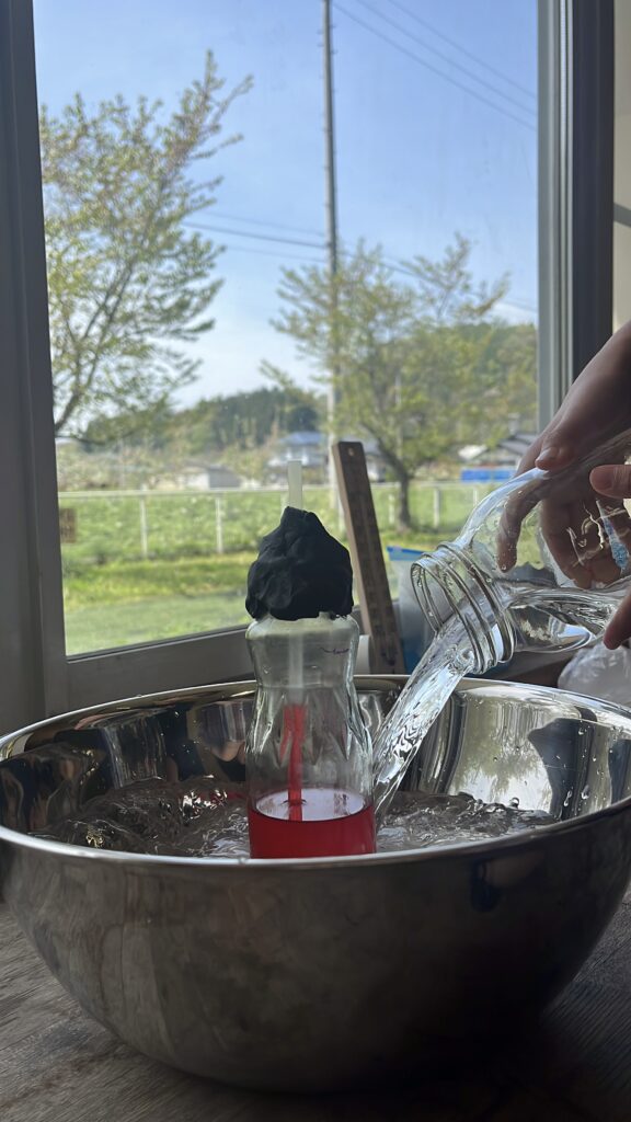 児童たちは、温度計の仕組みをより深く理解するために、実験を通して学びました。身近な材料を使い、水とアルコールを同量ずつ入れたガラス瓶で、自分たちだけの温度計を作りました。ストローを瓶に差し込み、粘土でしっかりと口をふさいで固定しました。