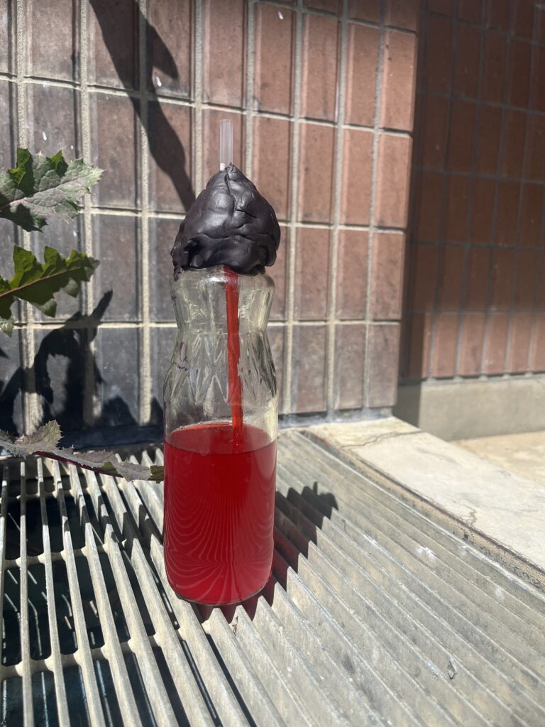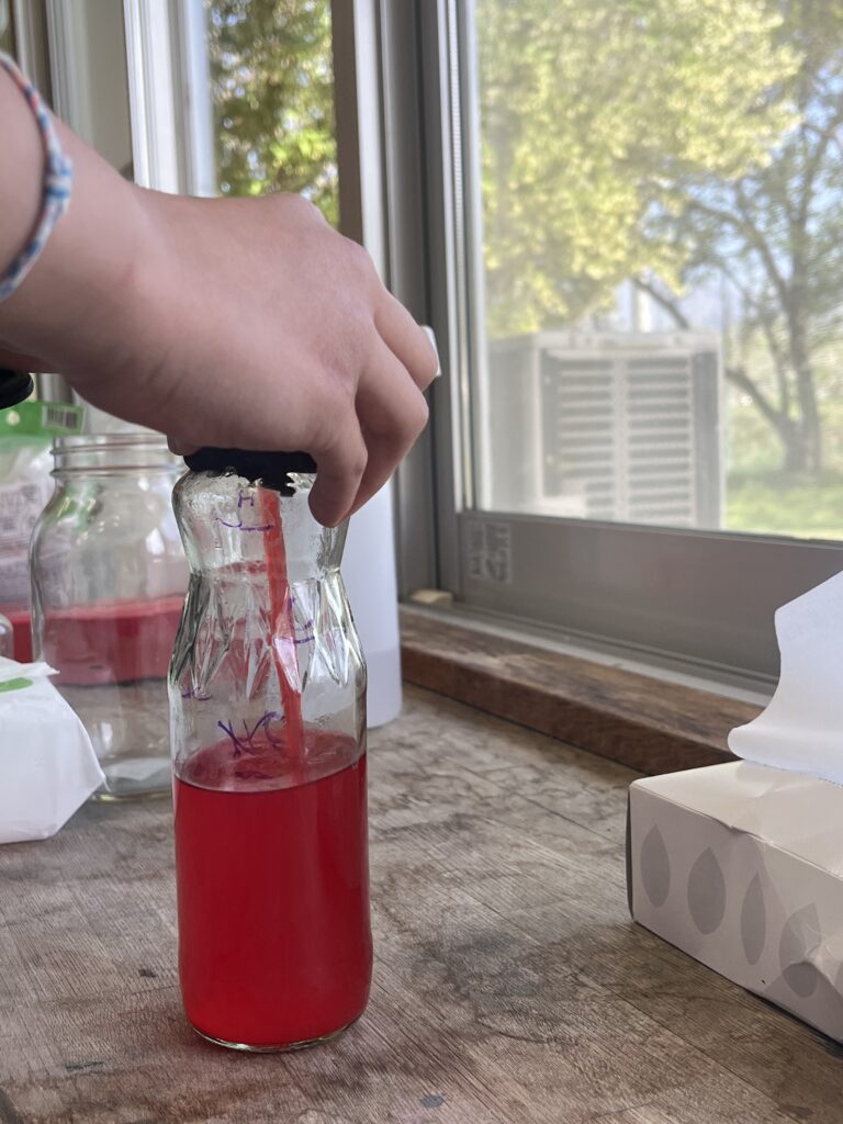 Students engaged in a hands-on experiment to better understand how thermometers work. Using simple materials, they created their own version of a thermometer with a glass bottle filled with equal amounts of water and alcohol. A straw was inserted into the bottle, and the opening was sealed with clay to hold it in place.