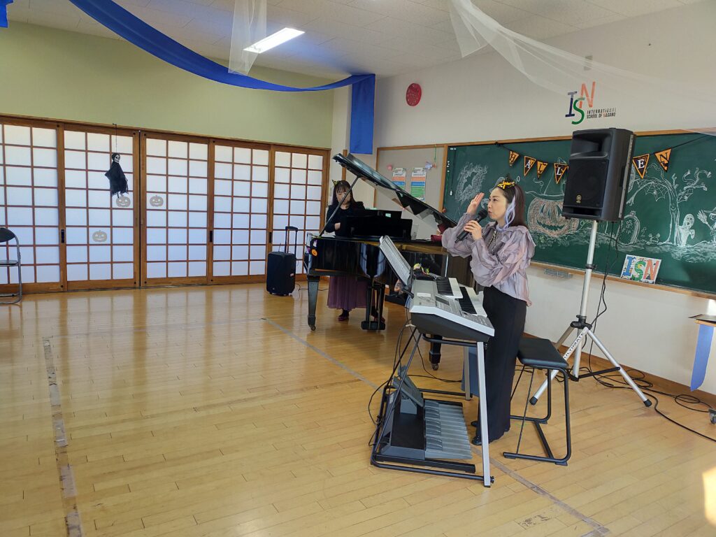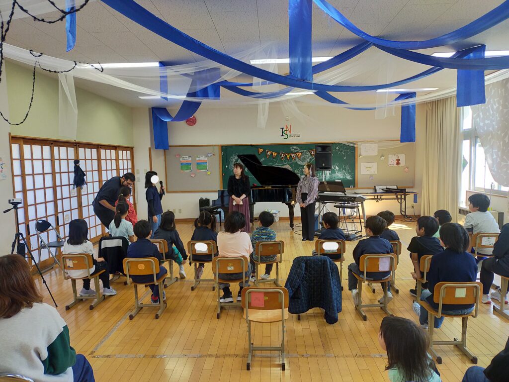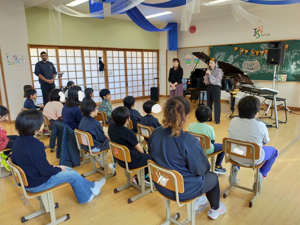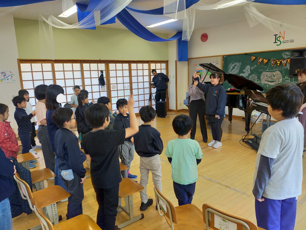また、学校では2名のゲストパフォーマーをお招きし、ミニコンサートを開催しました。子どもたちは、トランペット・フルート・シンバルなどの楽器や、指揮者の役割について楽しく学びました。演奏者の方々と一緒に踊ったりしながら、みんなで楽しい時間を過ごしました!