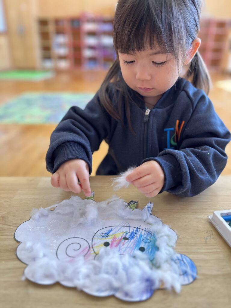 During indoor play, the children created crafts based on each month’s theme. They made projects inspired by the alphabet and freely explored different materials that engaged their five senses.