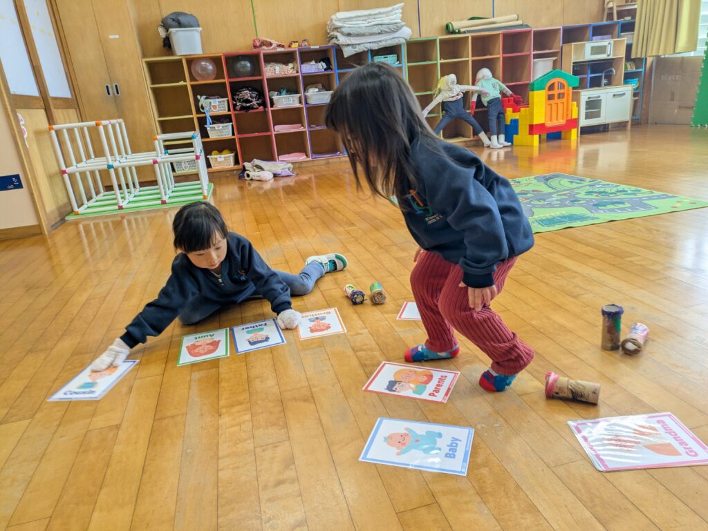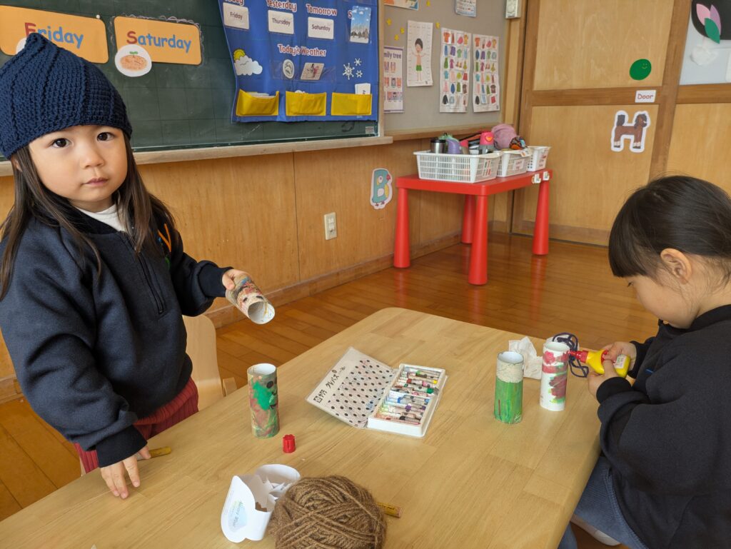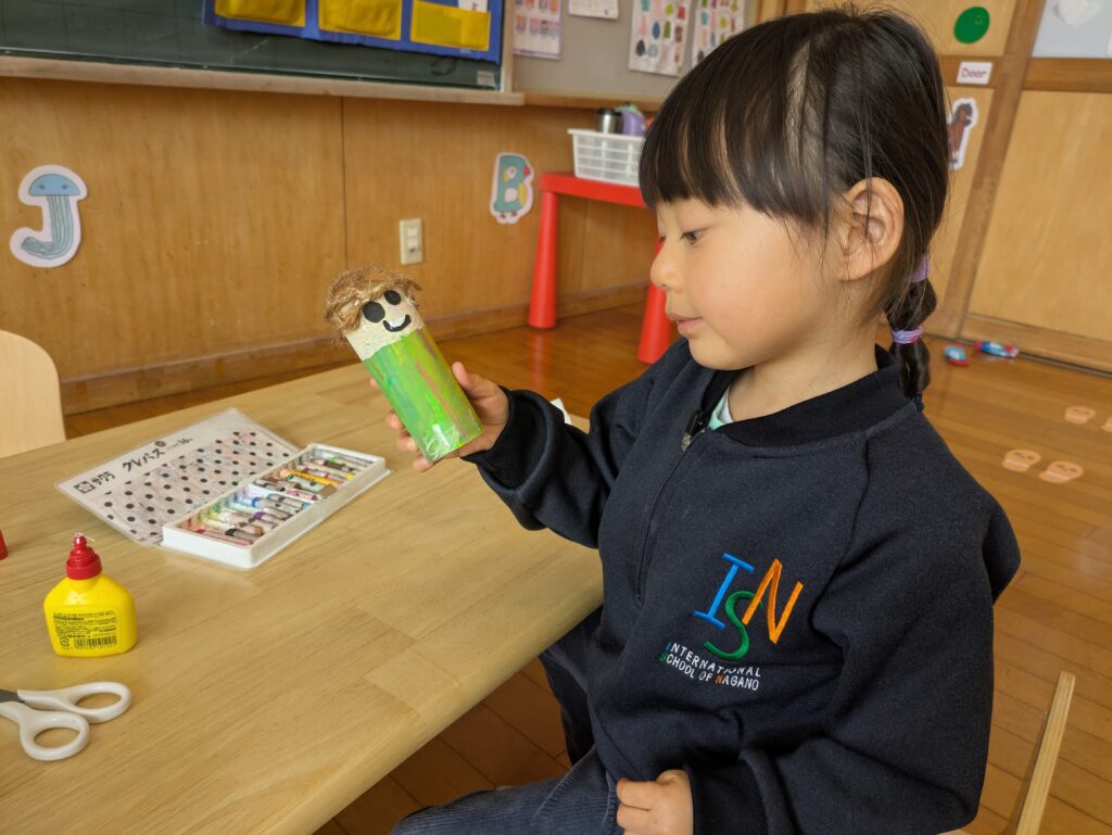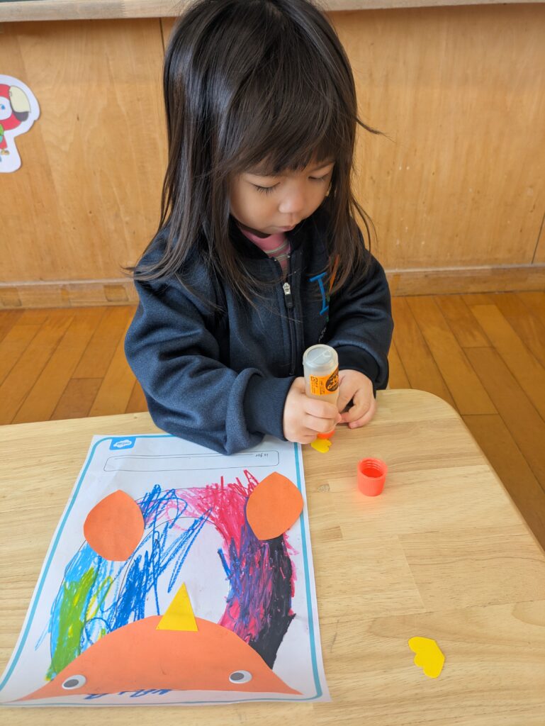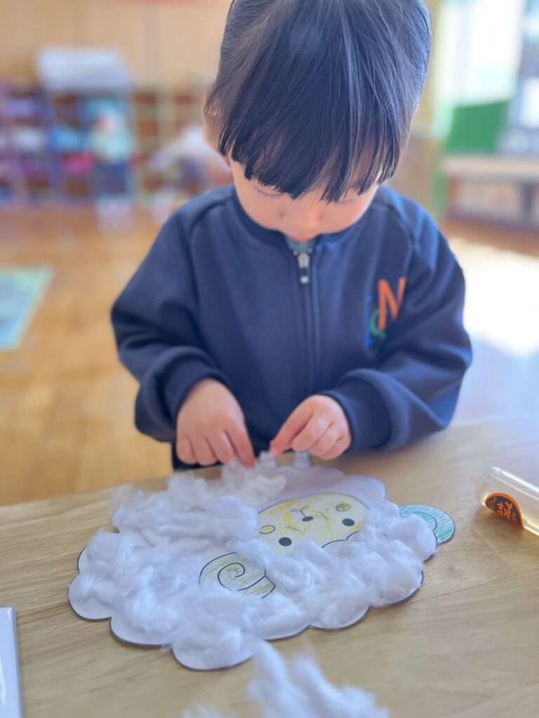 室内あそびでは、月ごとのテーマをもとにクラフト制作を楽しみました。アルファベットから連想するものを形にしたり、五感で楽しめるさまざまな素材を使って自由に表現したりと、それぞれがのびのびと取り組む姿が見られました。