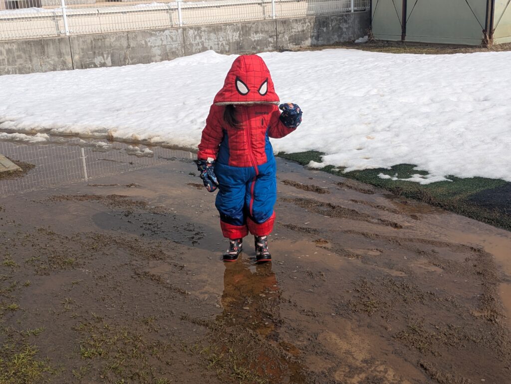 少しずつ冬が終わりに近づき、雪もとけ始めました。それとともに、子どもたちの外あそびにも変化が見られます。そり遊びを引き続き楽しみながらも、暖かさとともに現れる水たまりや泥まじりの雪にも興味津々です。