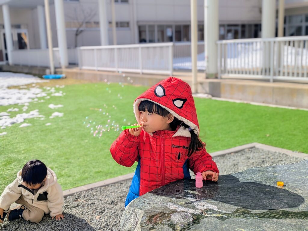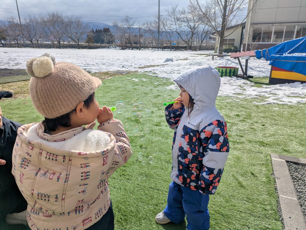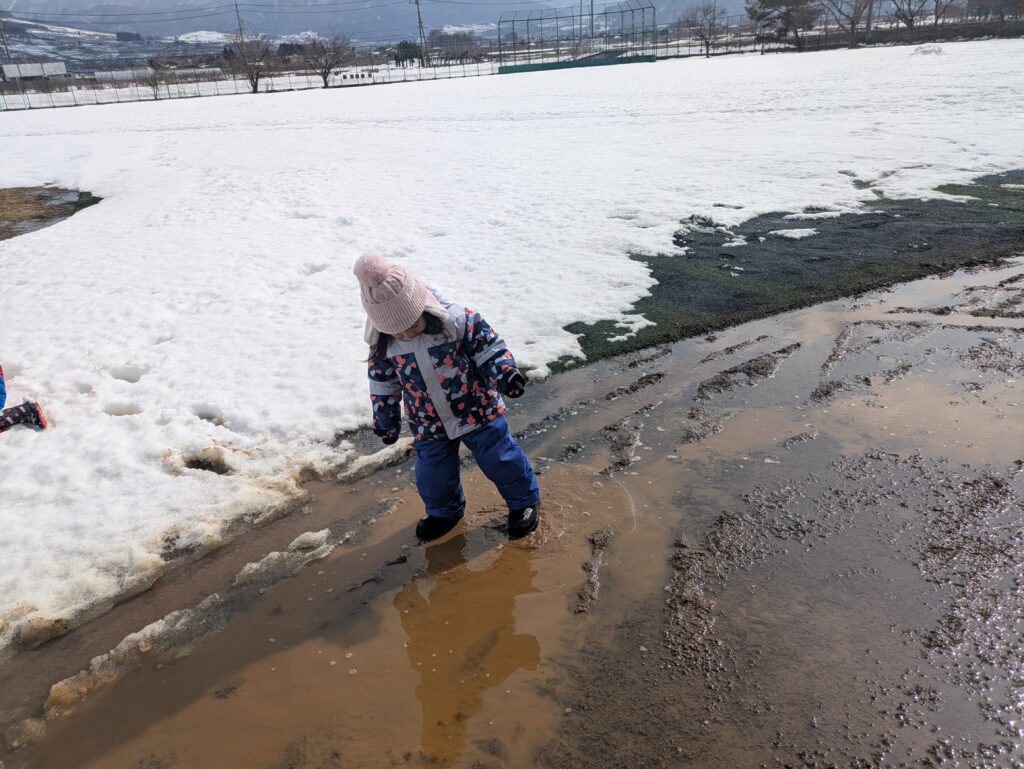 小さな水たまりに入ってみたり、やわらかくなったシャーベット状の雪を踏みしめたりと、夢中になって探索する姿が見られます。真冬のふわふわした雪とは違い、ぬれていたり、くっついたり、やわらかかったりと、さまざまな感触の違いにも気づいています。季節の移り変わりの中で、新しい発見や体験を楽しみながら、冬から春への変化を存分に味わっています。