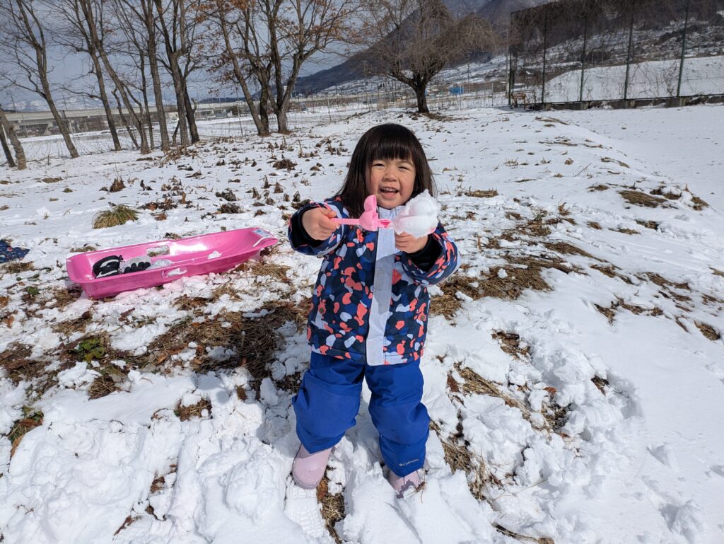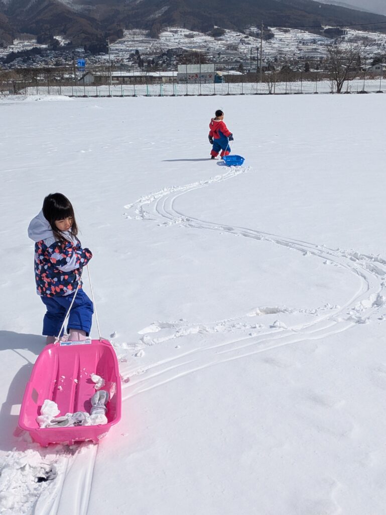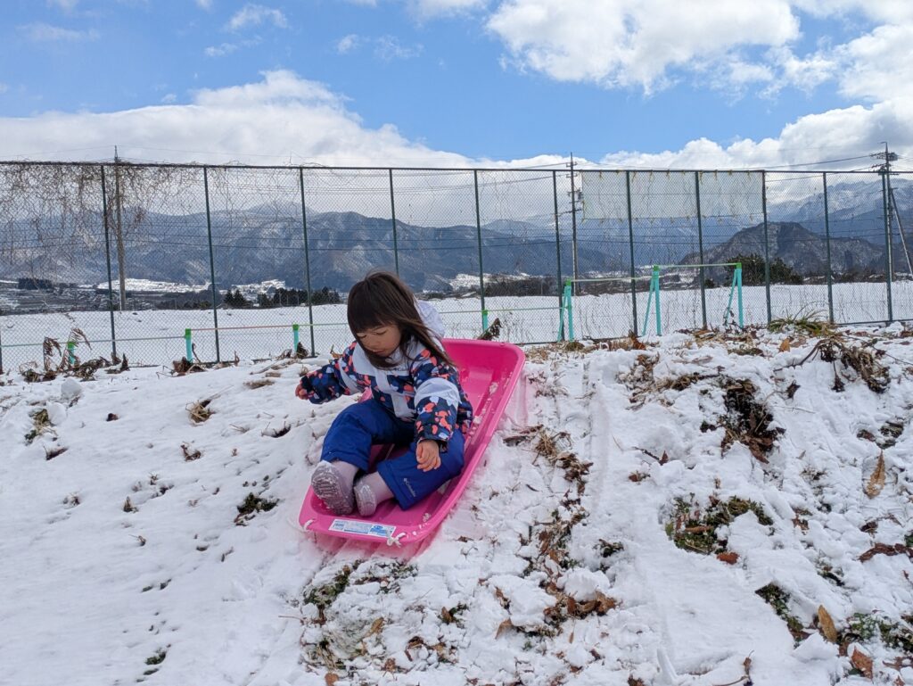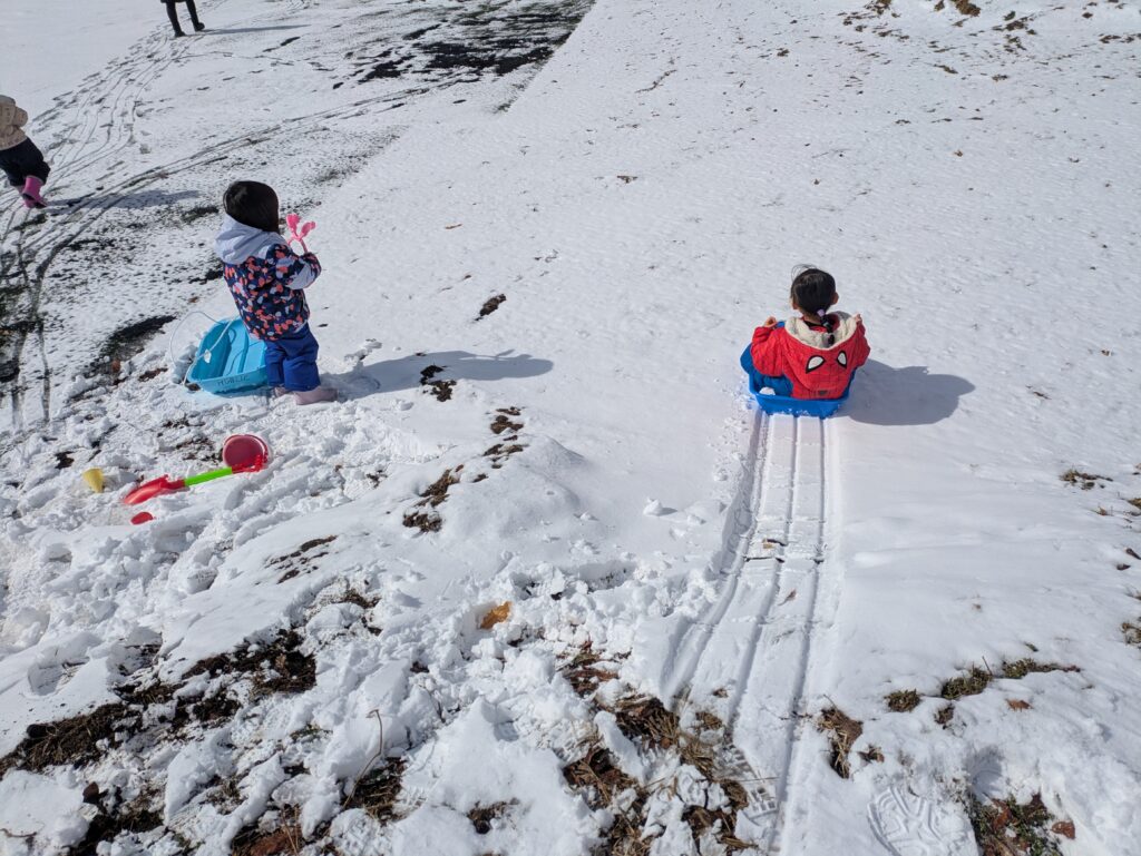 そり遊びでは小さな丘を自分で登り、そりで滑ることができたことがとてもうれしかったようで、何度も挑戦しては楽しそうに滑る姿が見られました。