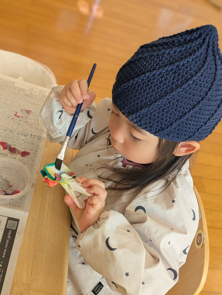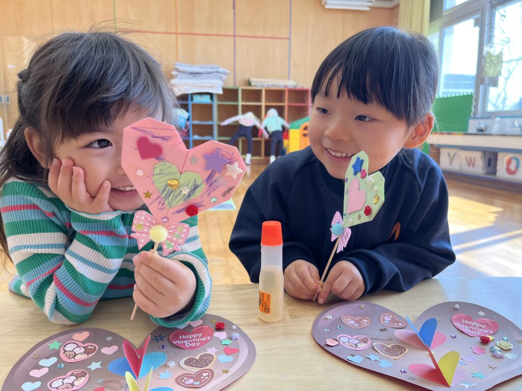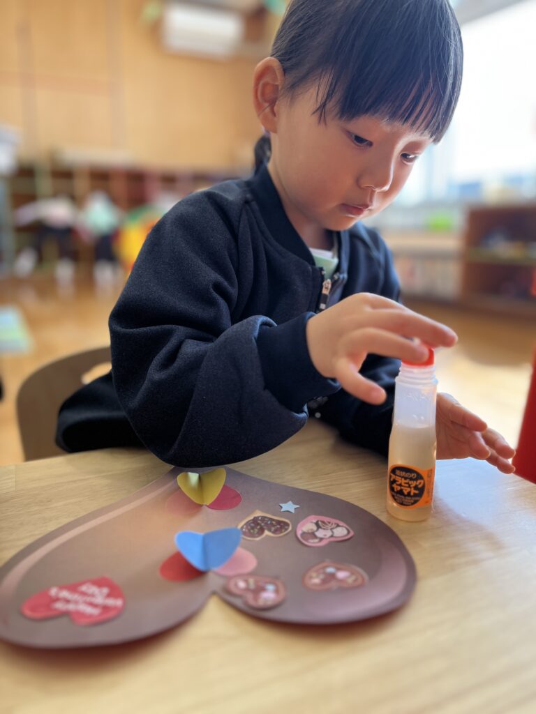今週はバレンタインデーのクラフトをいくつか制作しました、糊やシールの扱いも上手になってきており丁寧に取り組む姿がみられました。