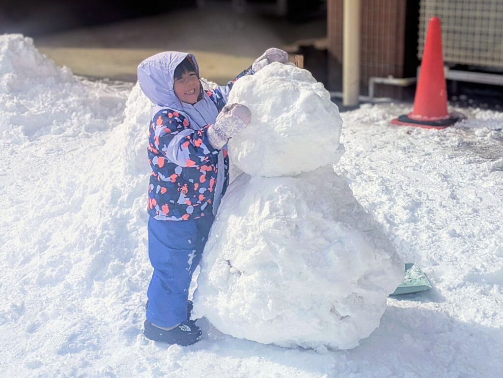 重たい雪玉も力いっぱい転がしながら、みんなで協力して完成させた雪だるま。出来上がると、その隣に並んでとてもうれしそうなレインボーさんたちでした。