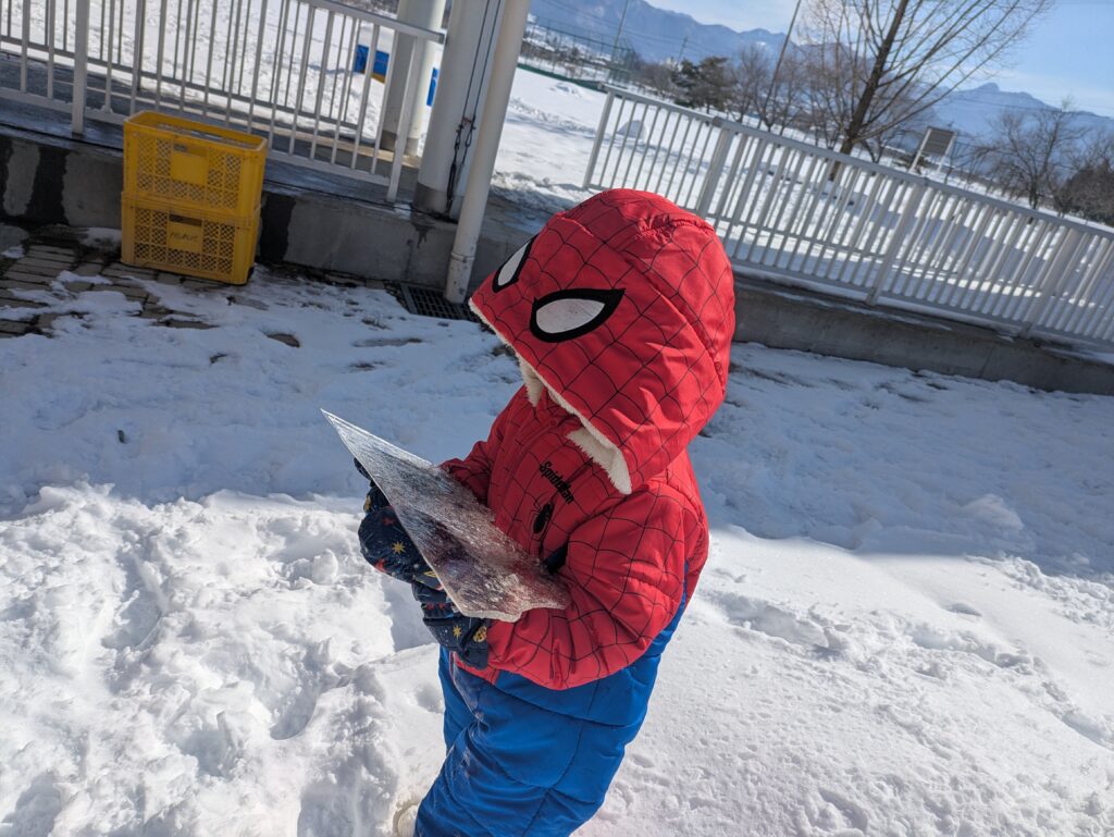 また、池に張った氷にも興味津々。パリッと割れる様子はまるでガラスのようで、その音や感触を楽しんでいました。大きくて平らな氷を池に放り投げ、「どうなるかな?」とじっと見つめる姿も見られ、冬の自然を存分に味わっています。