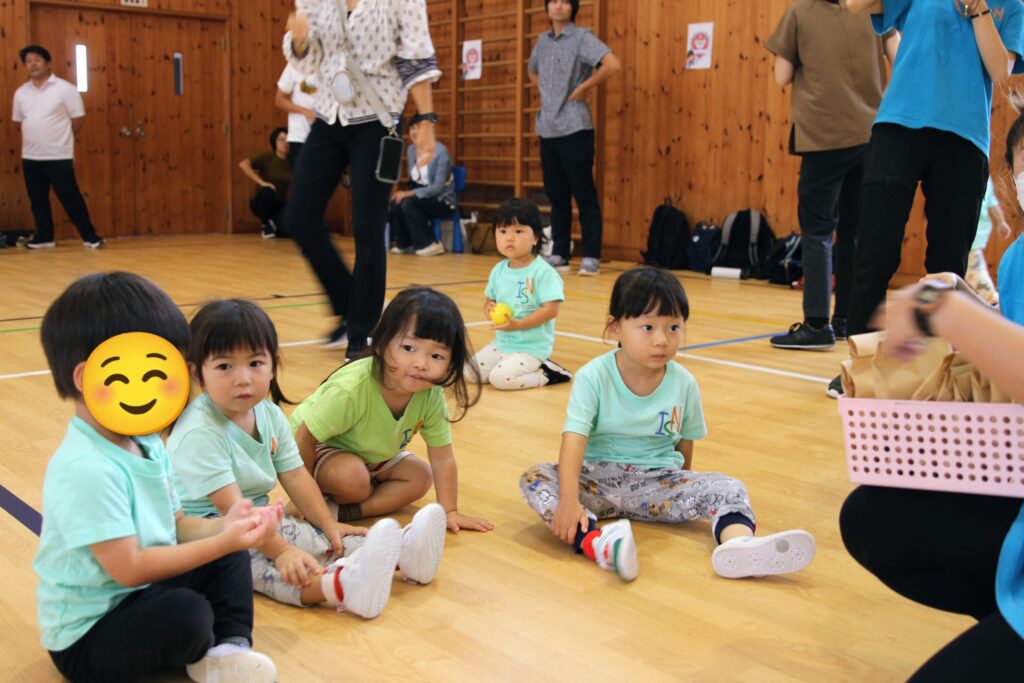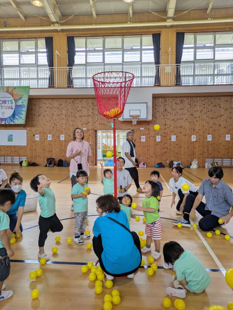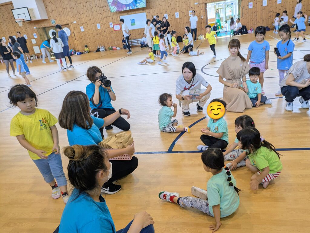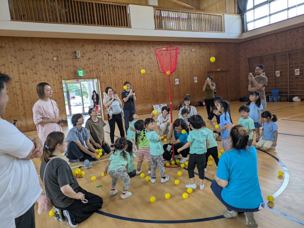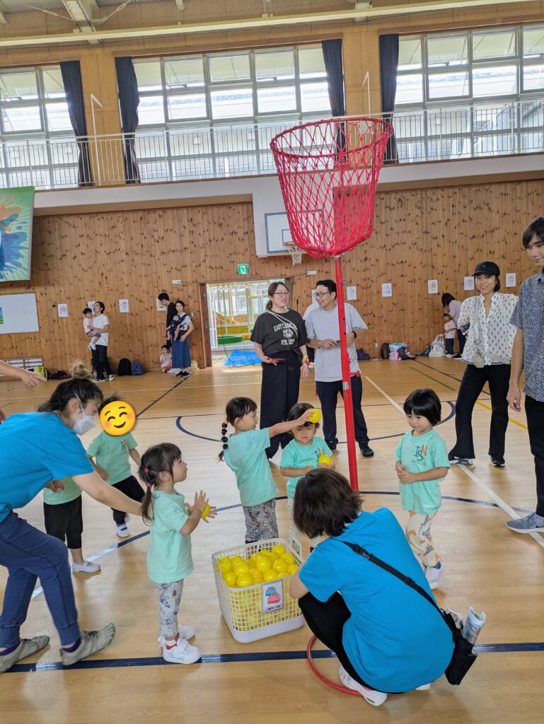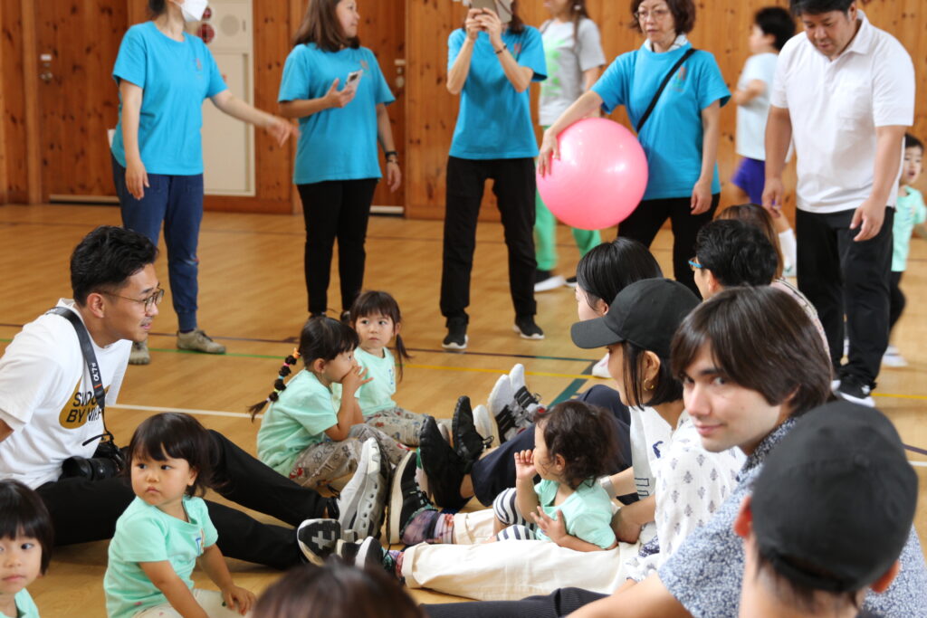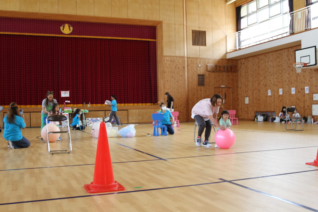 少し周りを気にしてためらう姿もありましたが、ご両親と手をつないで参加する姿はとてもかわいらしかったです。お母さんと一緒に風船を割ったり、みんなで足を使ってボールを運ぶレースに挑戦したりと、親子で楽しいひとときを過ごすことができました。