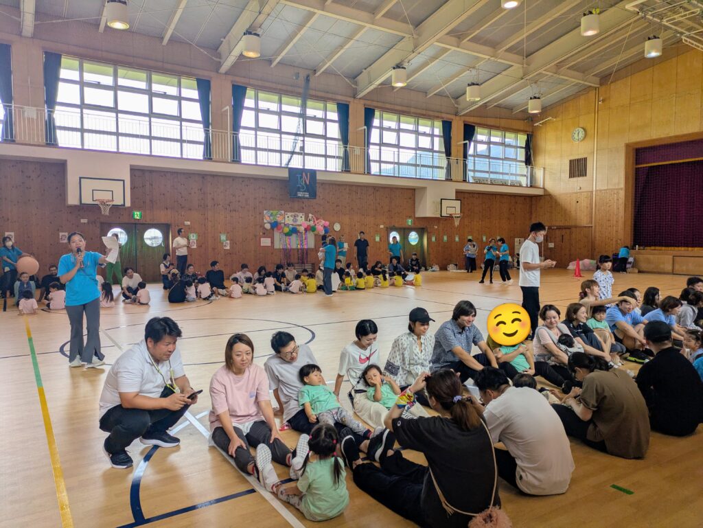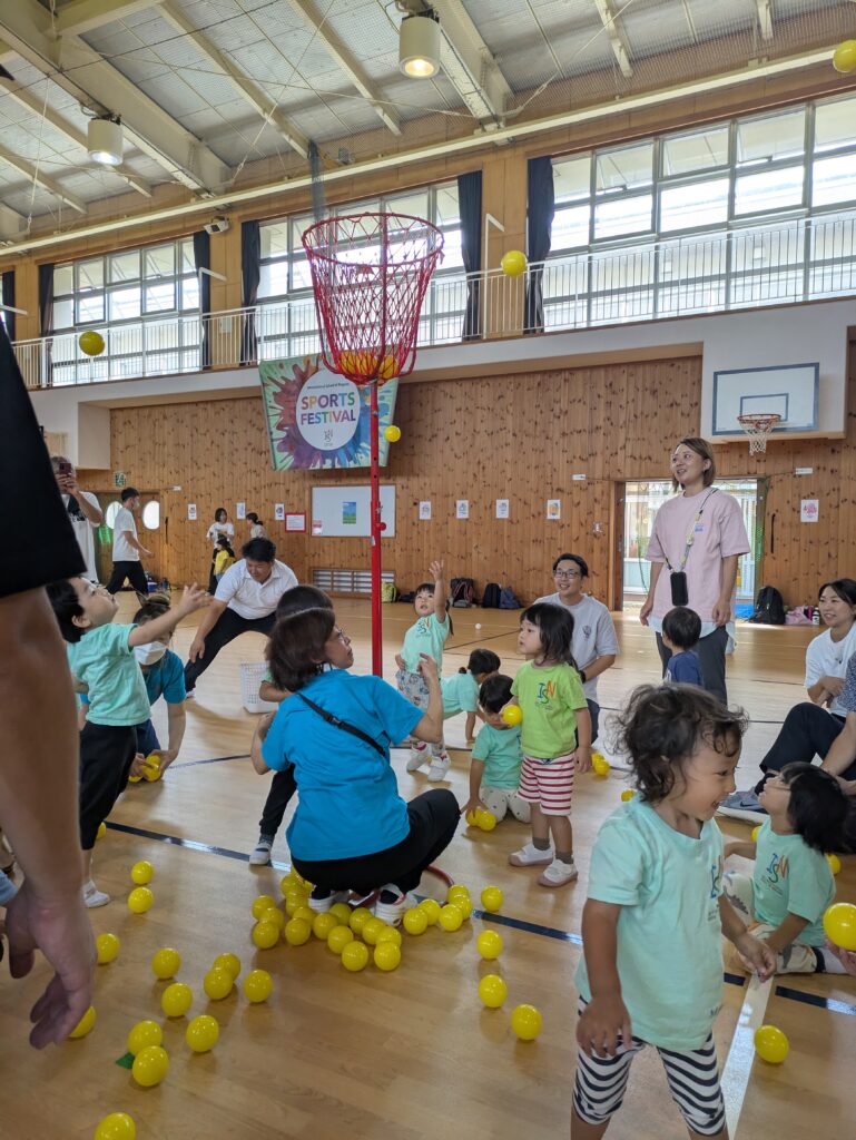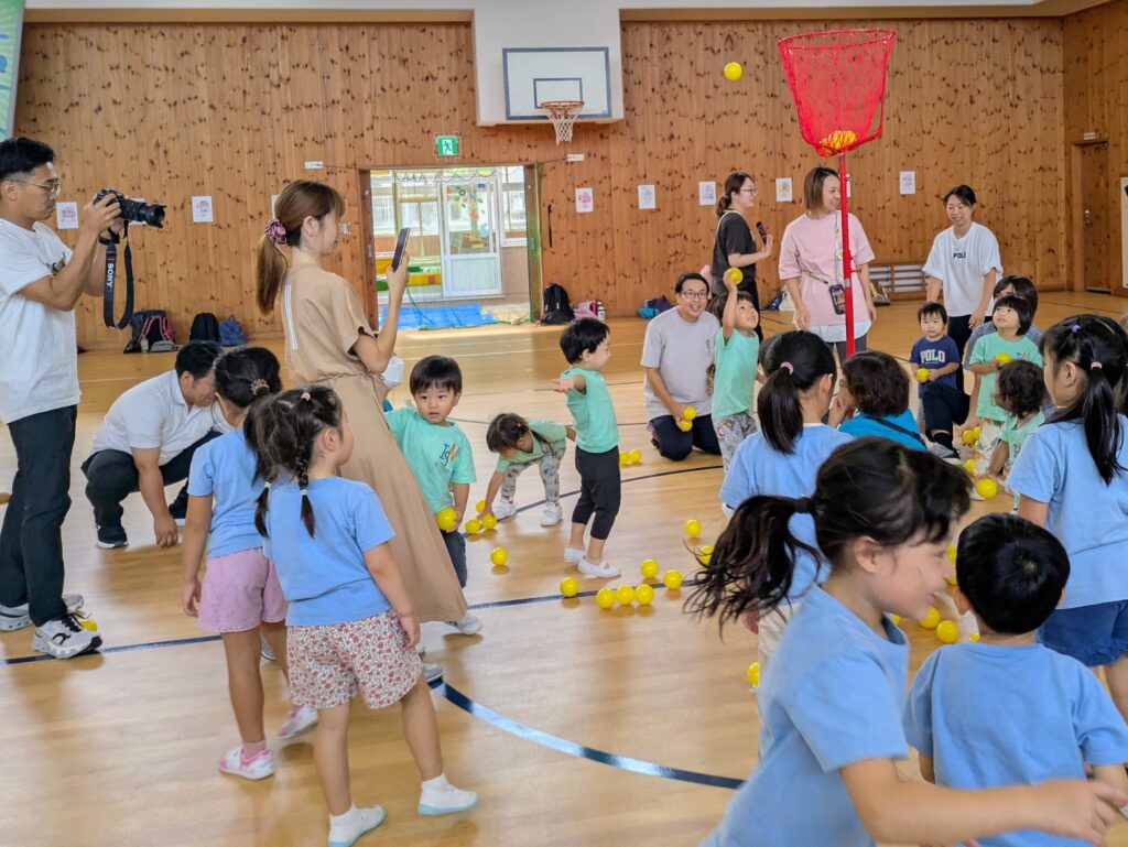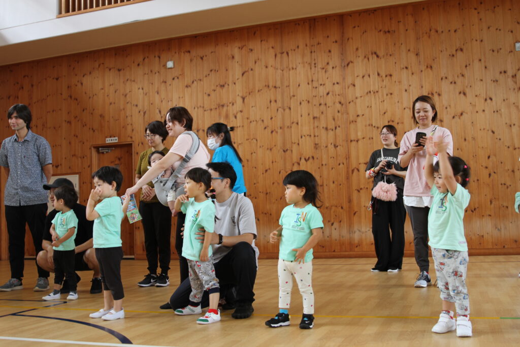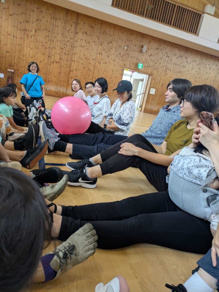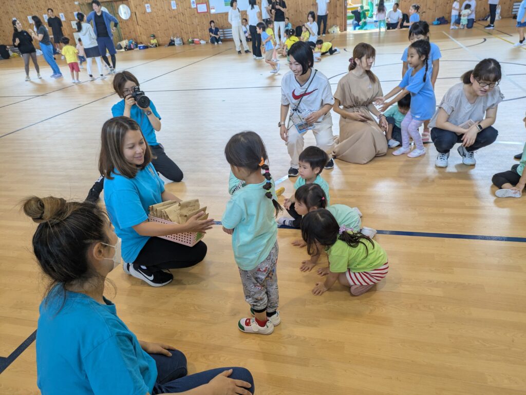 少し周りを気にしてためらう姿もありましたが、ご両親と手をつないで参加する姿はとてもかわいらしかったです。お母さんと一緒に風船を割ったり、みんなで足を使ってボールを運ぶレースに挑戦したりと、親子で楽しいひとときを過ごすことができました。