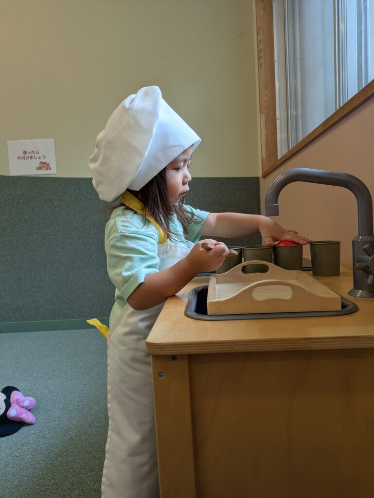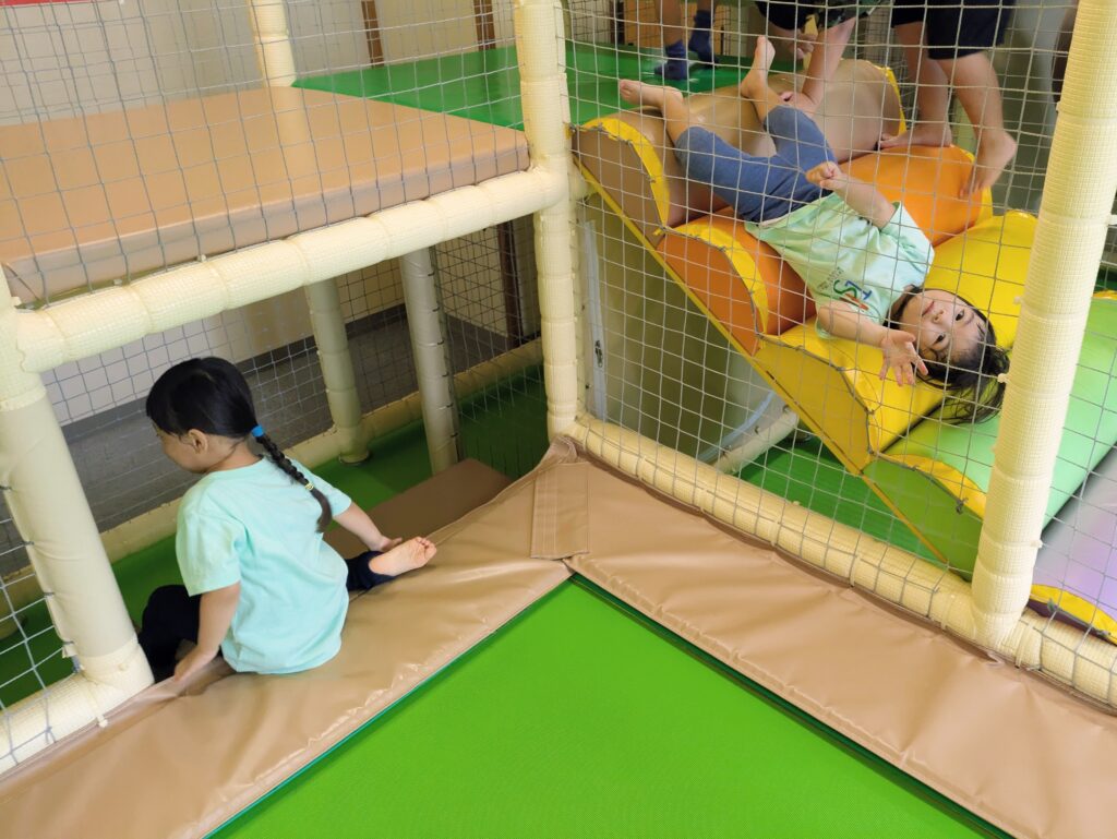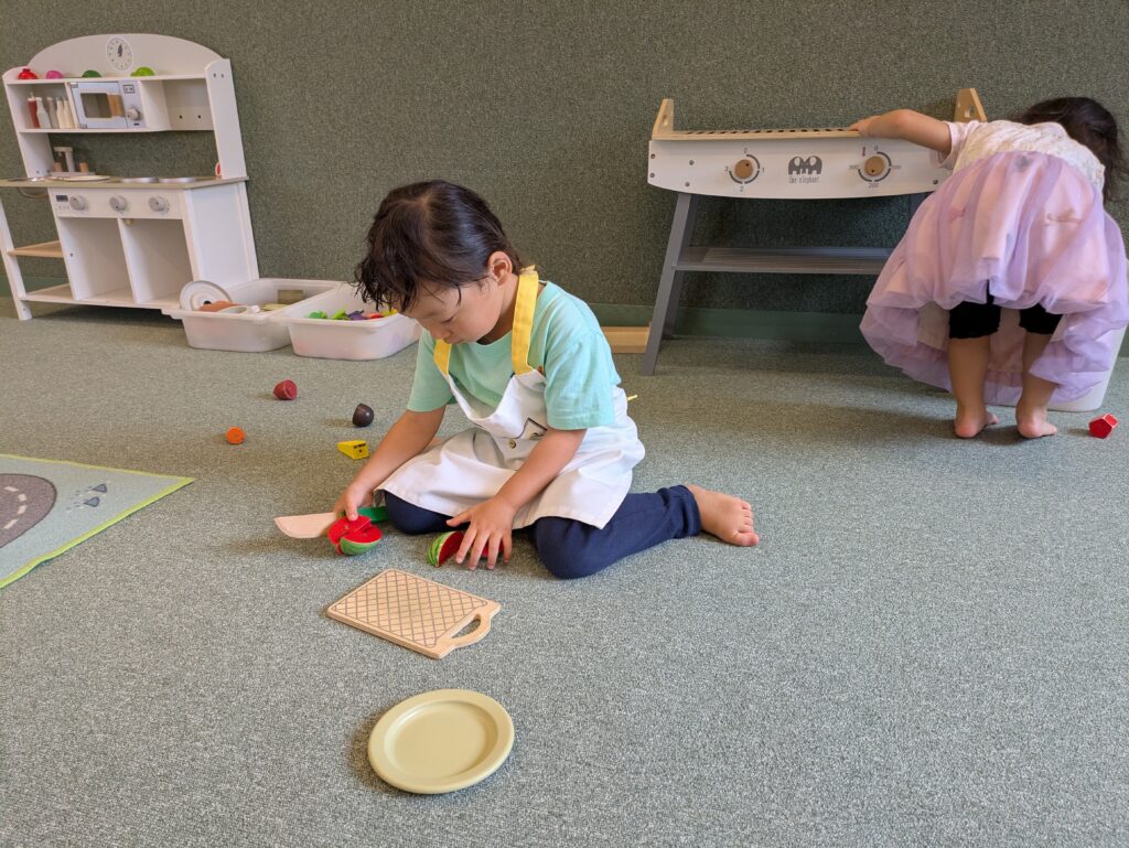 広いスペースの中遊具で思いきり体を動かしたあとは、おままごと遊びにも夢中になり、楽しい時間を過ごしました。