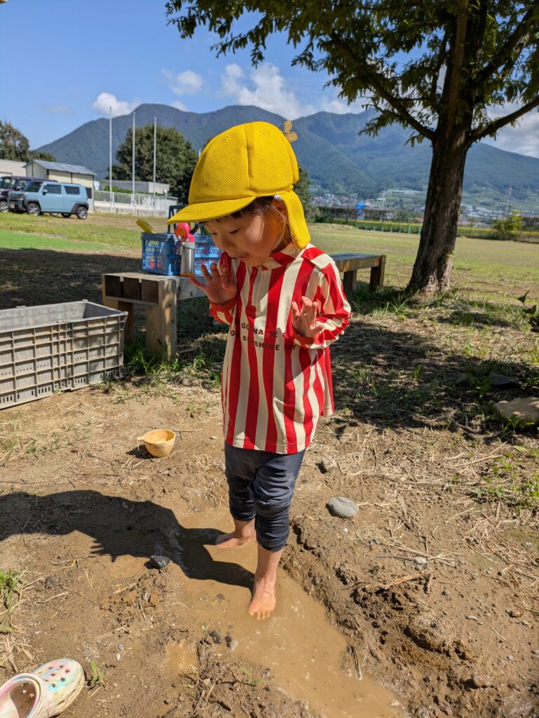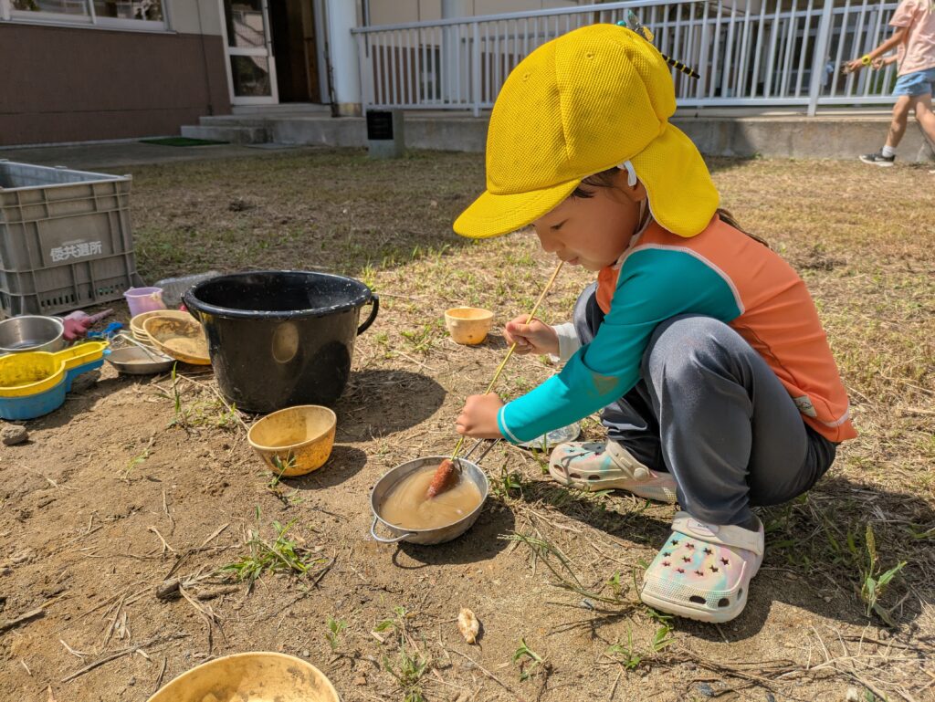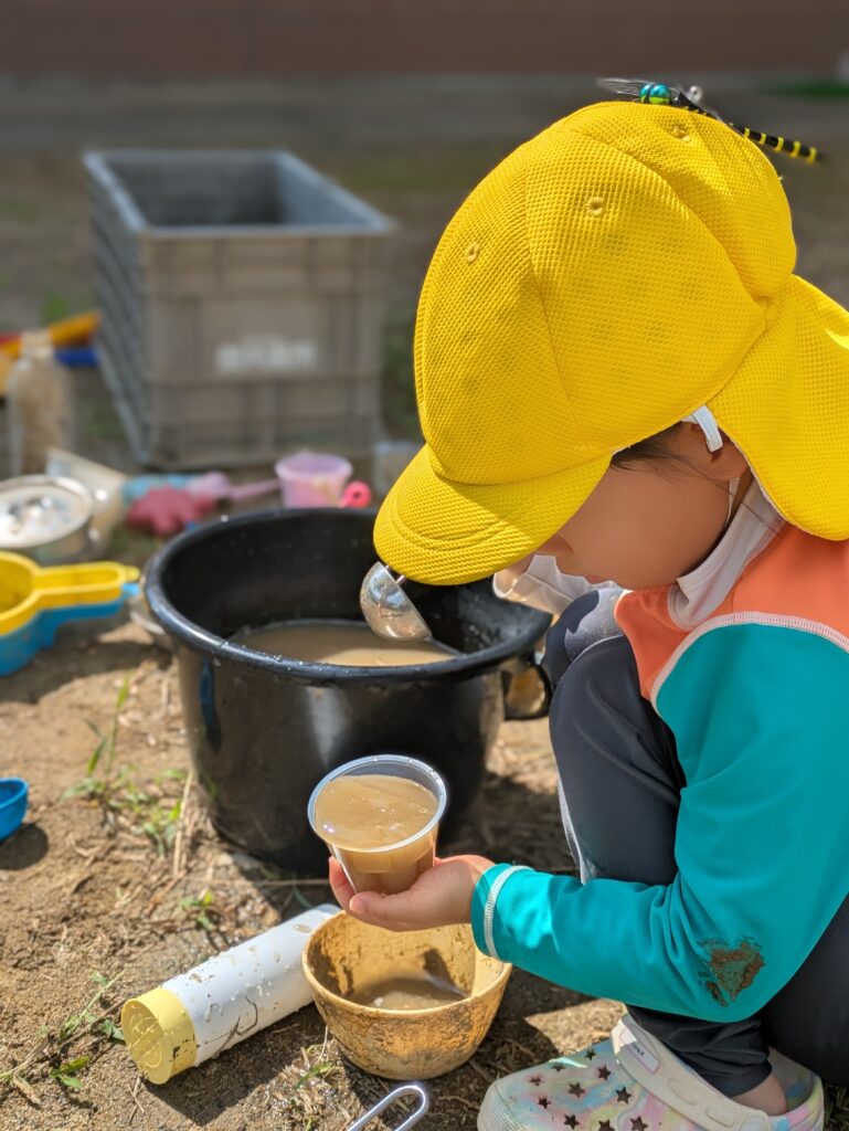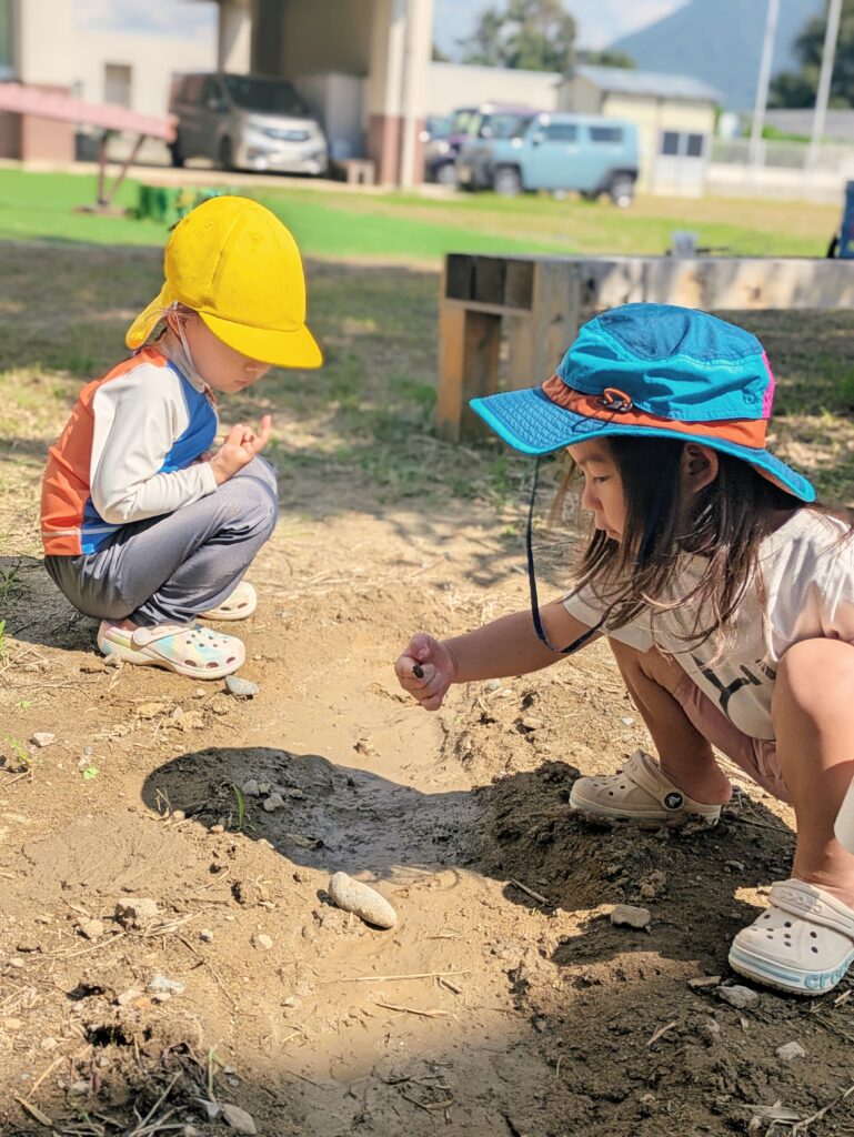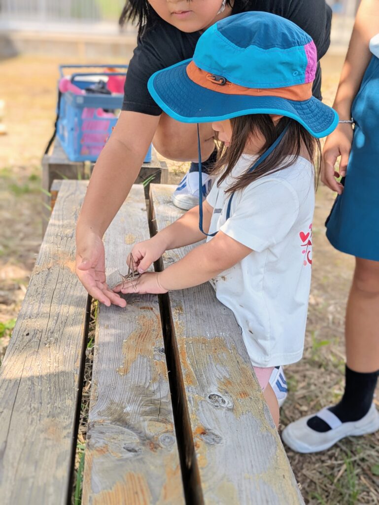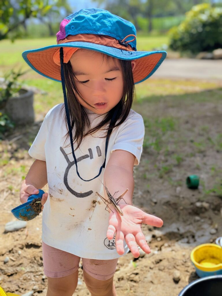 暖かい日には外でたっぷり体を動かしています。 前日にできた泥の水たまりが乾き、やわらかい泥の層になっているのを発見したレインボーさんたち。 「チョコレートみたい!」「においをかいでごらん」「いい匂いだ!」と、指先で感触を確かめながら友達と見せ合い、泥のさまざまな姿を楽しんでいました。 水を混ぜたり、ボトルに移し替えたりと、遊びの中で手先の動きがどんどん器用になってきているのを感じます。 そこへ突然、大きなショウリョウバッタが登場!怖がらずに捕まえ、そっと腕にのせて観察する姿がありました。自然の中で過ごすことで、好奇心や挑戦する気持ちが大きく育っているのだと実感します。 たくましさと可愛らしさがあふれる、レインボーさんたちの成長を感じるひとときでした。