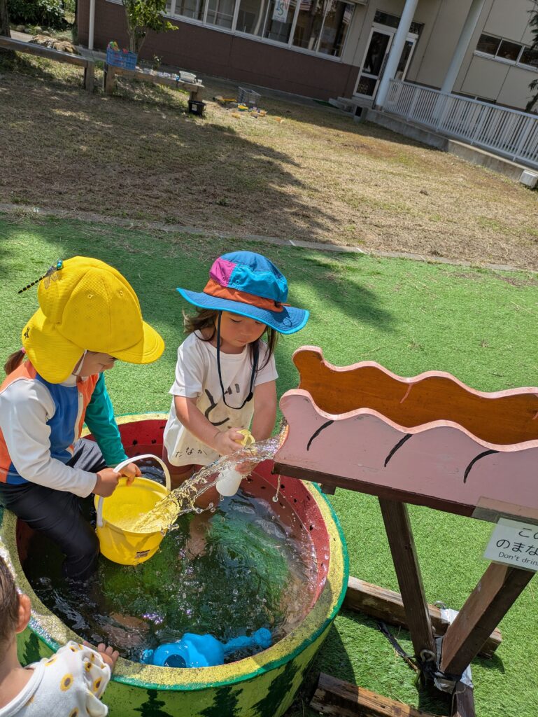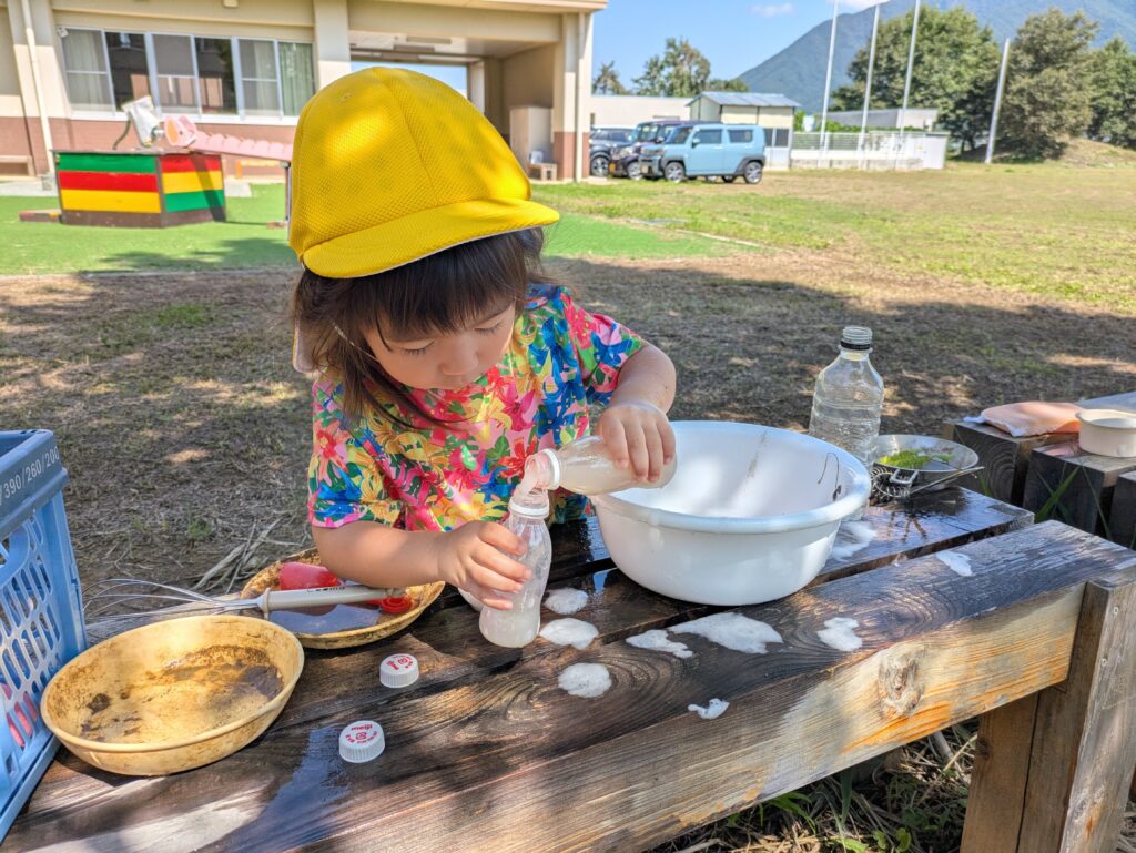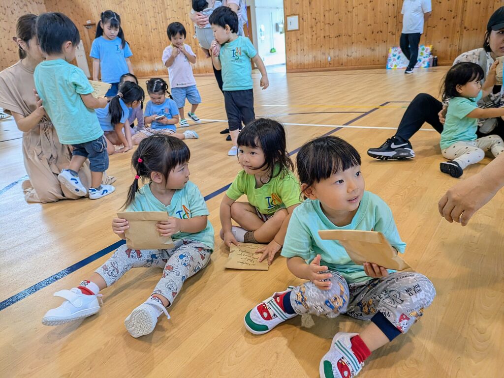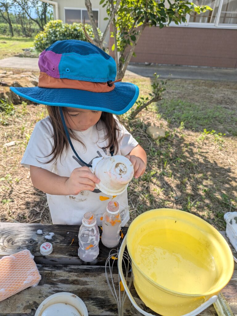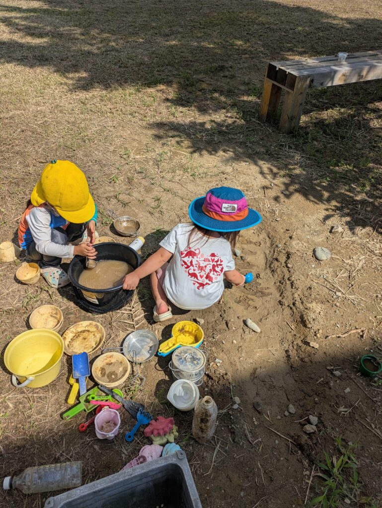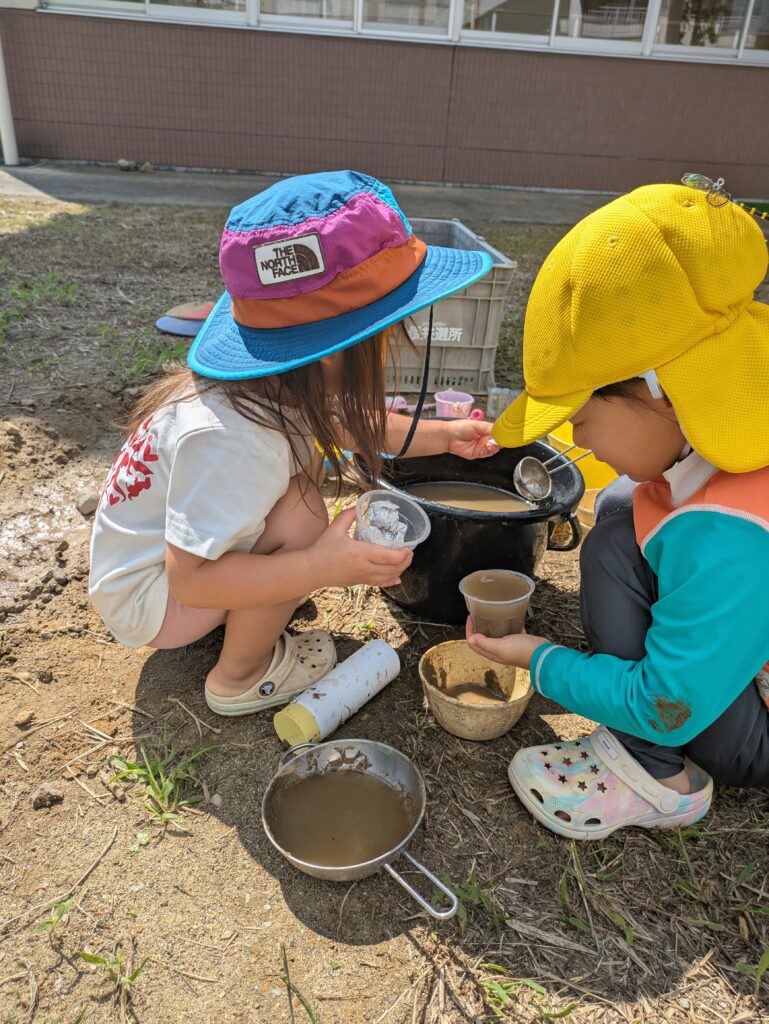 暖かい日には外でたっぷり体を動かしています。 前日にできた泥の水たまりが乾き、やわらかい泥の層になっているのを発見したレインボーさんたち。 「チョコレートみたい!」「においをかいでごらん」「いい匂いだ!」と、指先で感触を確かめながら友達と見せ合い、泥のさまざまな姿を楽しんでいました。 水を混ぜたり、ボトルに移し替えたりと、遊びの中で手先の動きがどんどん器用になってきているのを感じます。 そこへ突然、大きなショウリョウバッタが登場!怖がらずに捕まえ、そっと腕にのせて観察する姿がありました。自然の中で過ごすことで、好奇心や挑戦する気持ちが大きく育っているのだと実感します。 たくましさと可愛らしさがあふれる、レインボーさんたちの成長を感じるひとときでした。