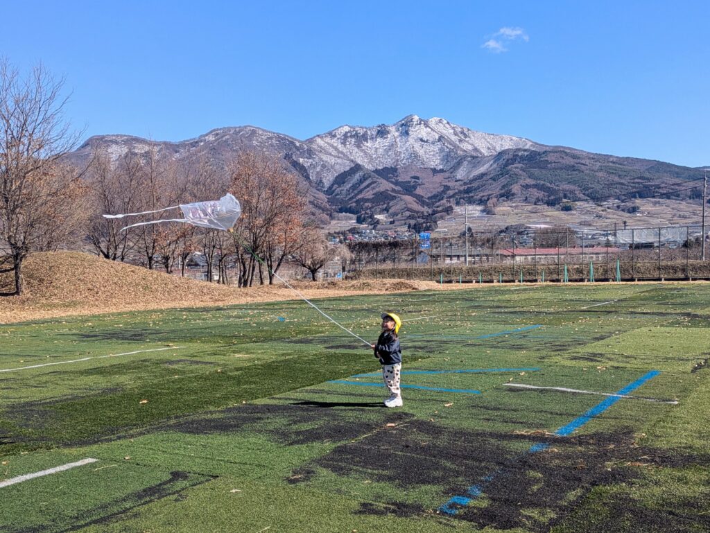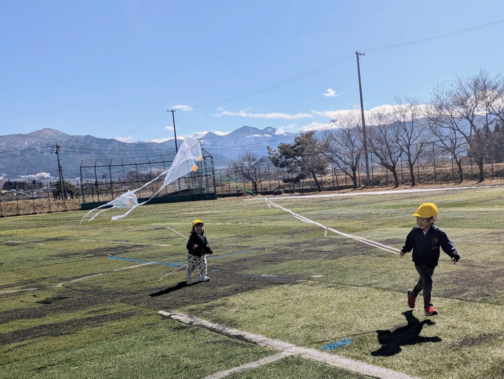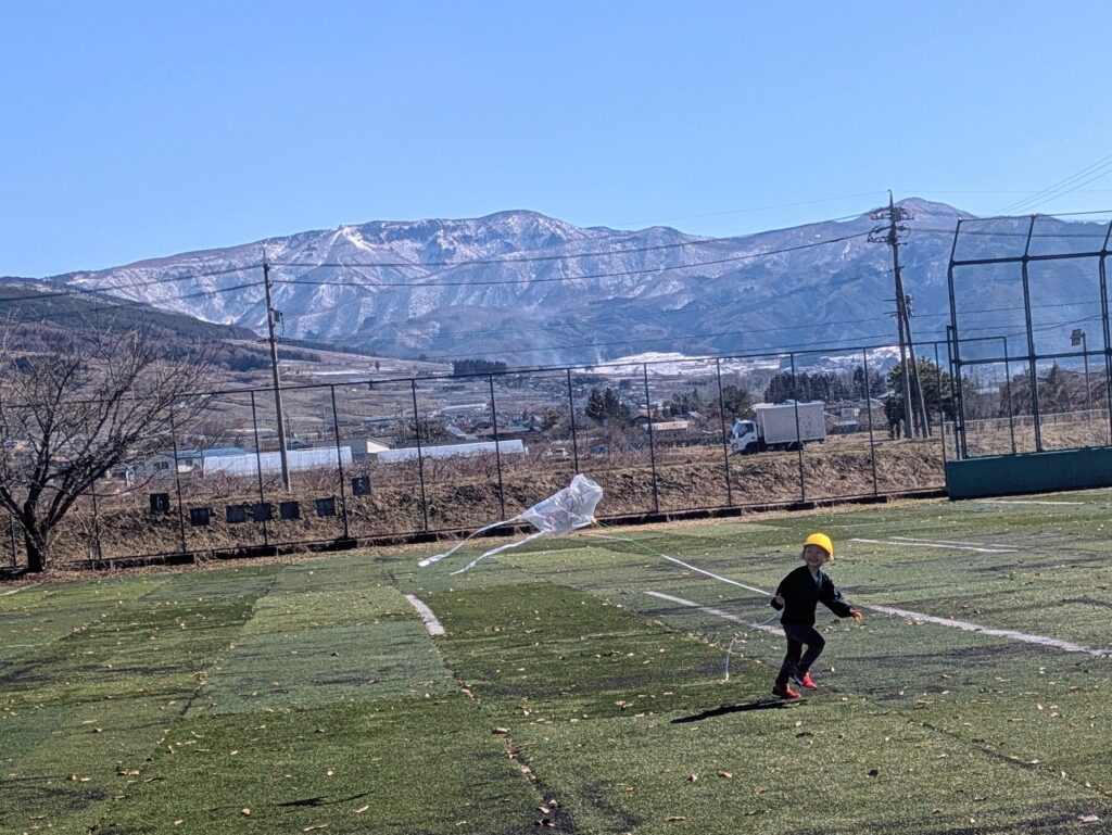 手作りの凧でしたが、とてもよく空に上がり、子どもたちは広いグラウンドを何周も走りながら、空高く飛ぶ凧をうれしそうに見上げていました。